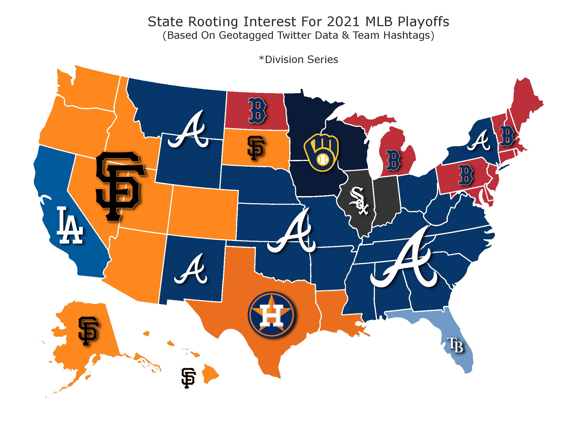 A map created by Sportsbetting.ag using geotagged Twitter data from the last week shows 19 states are rooting for the Braves in the MLB postseason, making them the most popular team across the United States. The Boston Red Sox came in second with 12 states, followed closely by the San Francisco Giants with 10.