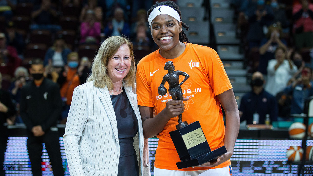 Jones' dominant play propelled the Connecticut Sun to a WNBA-leading 26-6 record. She averaged 19.4 points, 11.2 boards, 2.8 assists, 1.3 steals, and 1.3 blocks en route to capturing league MVP honors in a near-unanimous vote. The 6-foot-6 forward is the only player in WNBA history to have won MVP, Sixth Women of the Year, and the Most Improved Player award in her career. Jones also earned her third rebounding crown, second WNBA All-Defensive first-team nod, and first All-WNBA first-team selection.