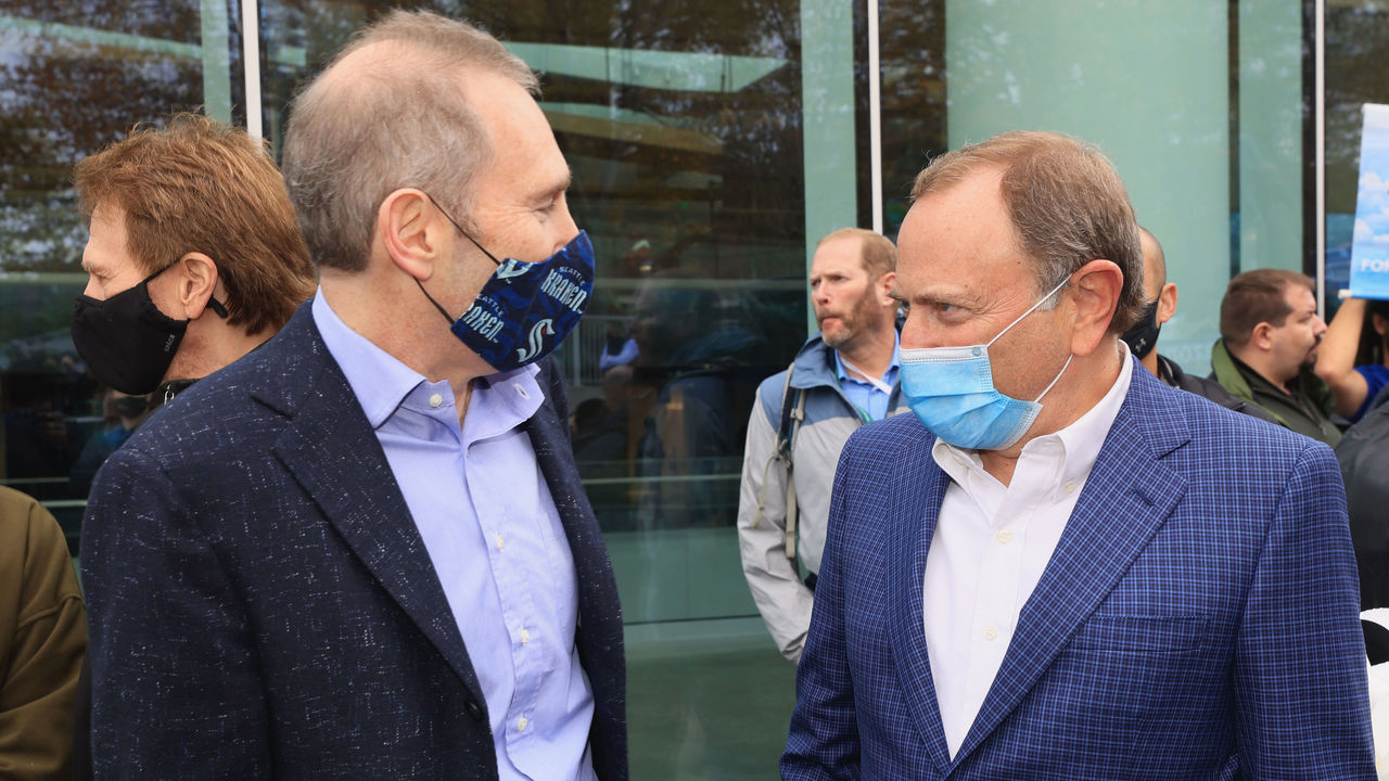 Amazon CEO Andy Jassy and NHL commissioner Gary Bettman chat at the Seattle Kraken opener in October. Amazon bought the naming rights to the Climate Pledge Arena. Bruce Bennett / Getty Images