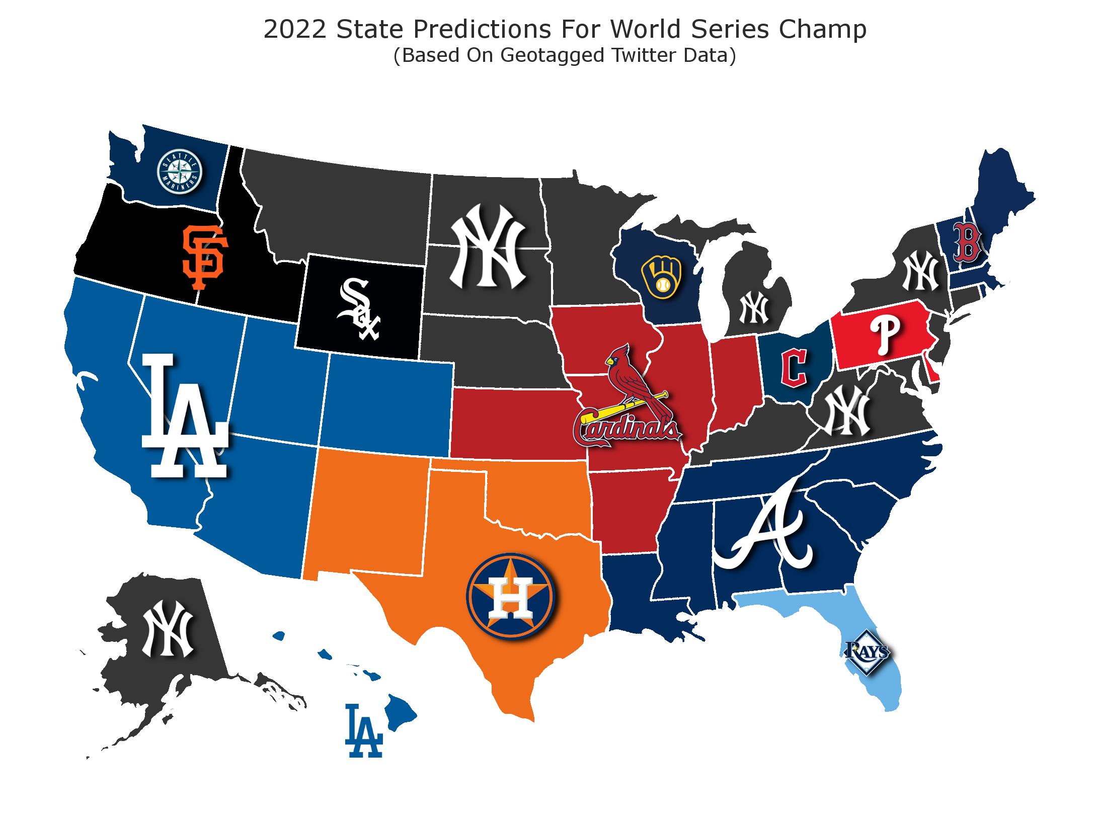 A map created by Betonline.ag based on geotagged Twitter data from the last 30 days, including over 120,000 tweets, shows that, by state, users most frequently tabbed the Yankees to win the World Series.