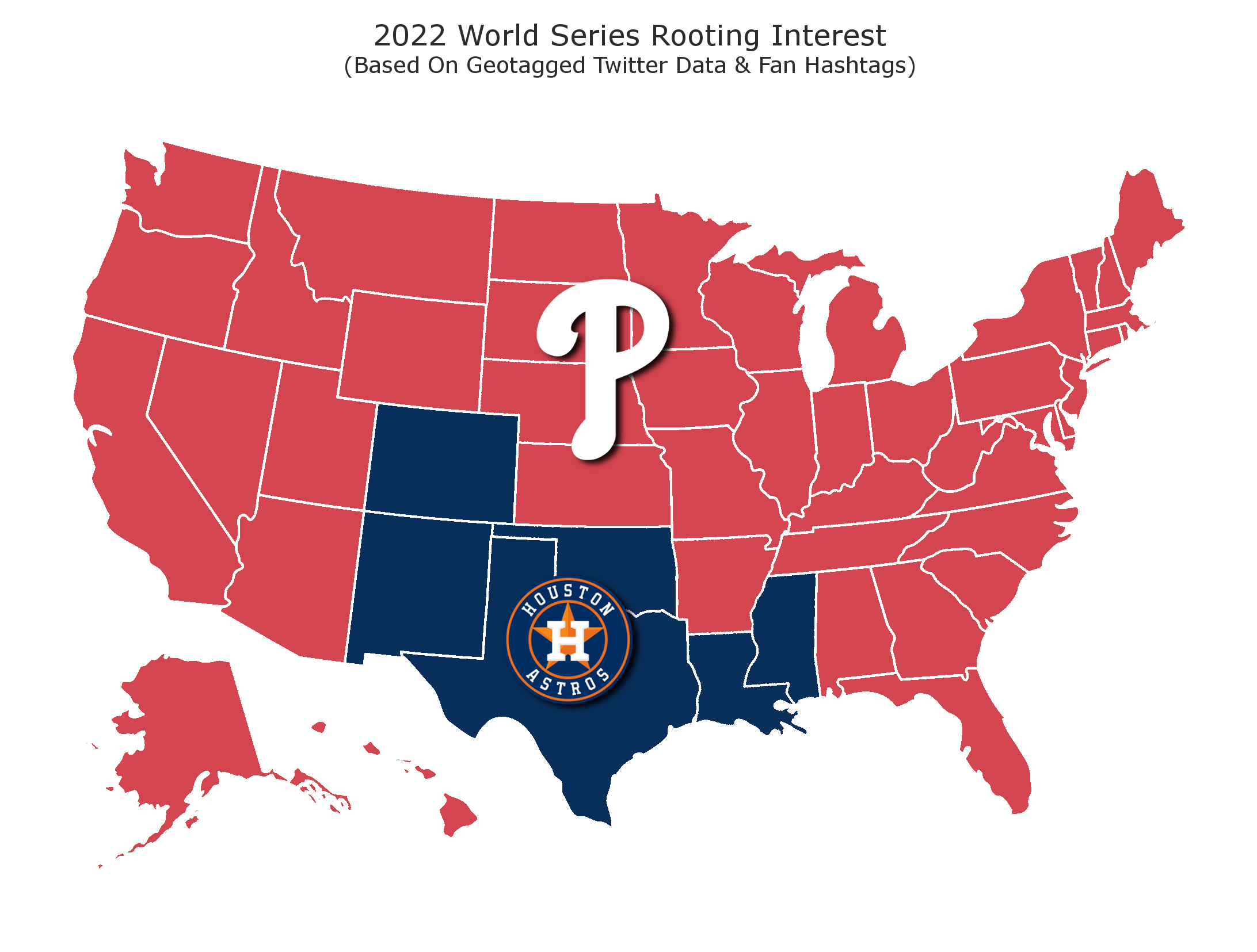 A map created by Betonline.ag using geotagged Twitter data gathered since the matchup was set, including over 105,000 tweets containing official fan hashtags, shows the Phillies are favored in 44 states, while the Astros are favored in six.