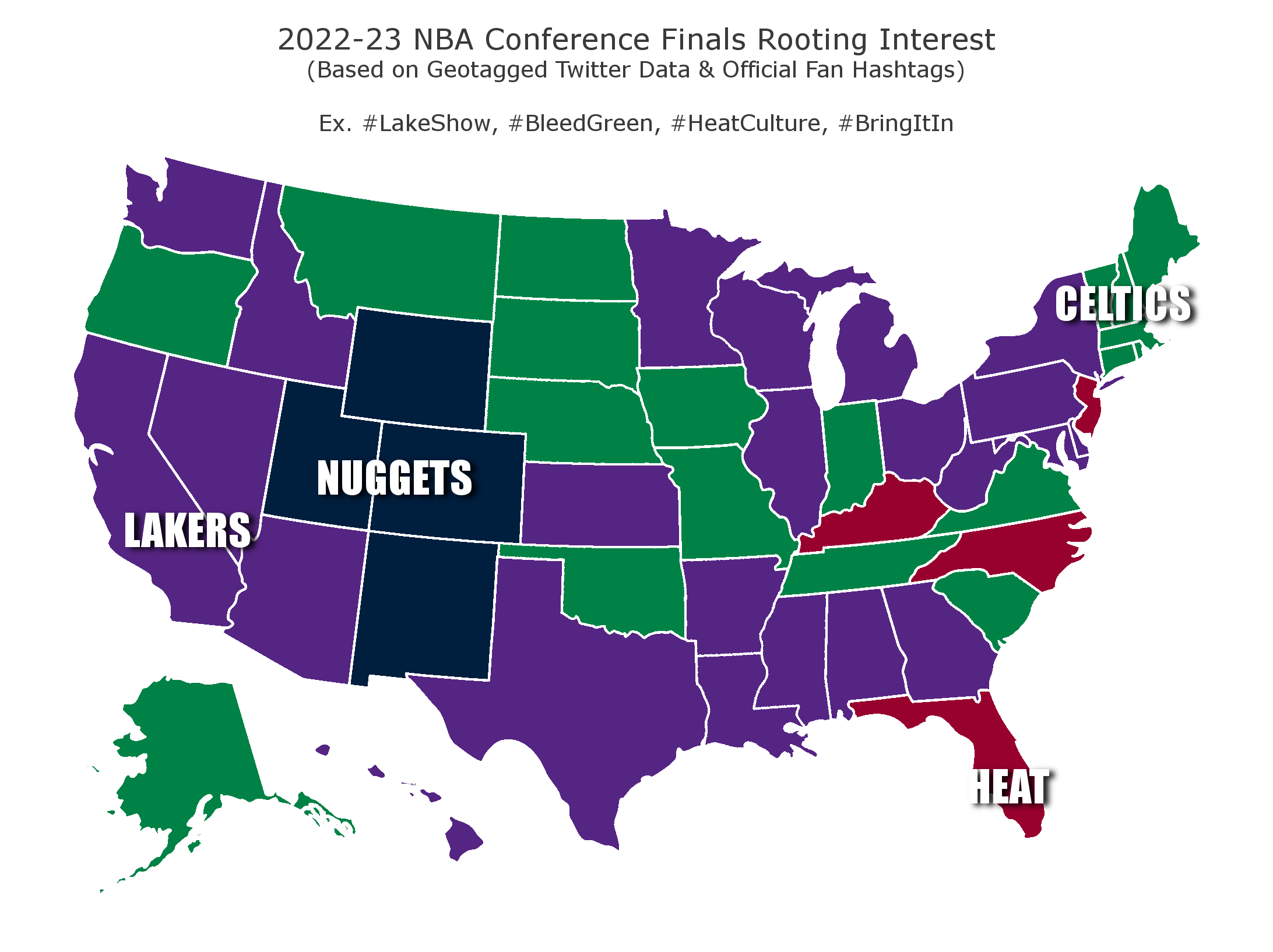 The Lakers were the most popular pick overall with 23 states rooting for them to win, followed by the Celtics with 19 states. The Miami Heat and Denver Nuggets were each favored in four states.