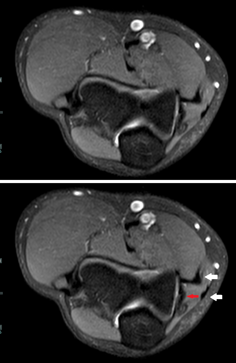 If it's torn, or completely torn, there will be slices or patches of white cutting through or obscuring the ligament. Swelling around the ligament can make diagnosing an issue difficult.