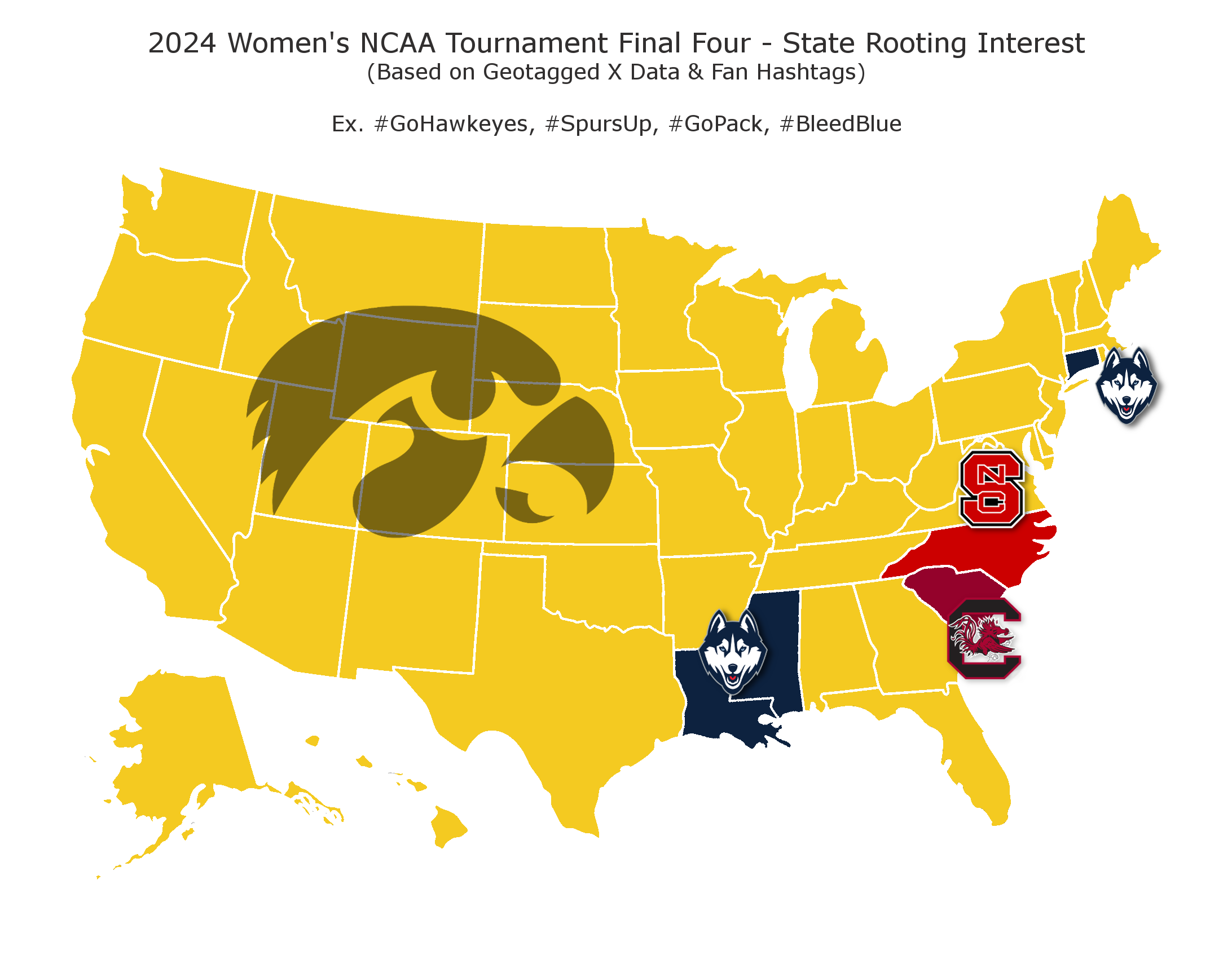 A map created by BetOnline.ag based on geotagged X data gathered since Sunday - including over 270,000 tweets containing official fan hashtags - shows Iowa is the overwhelming favorite NCAA Tournament Final Four team across the United States.