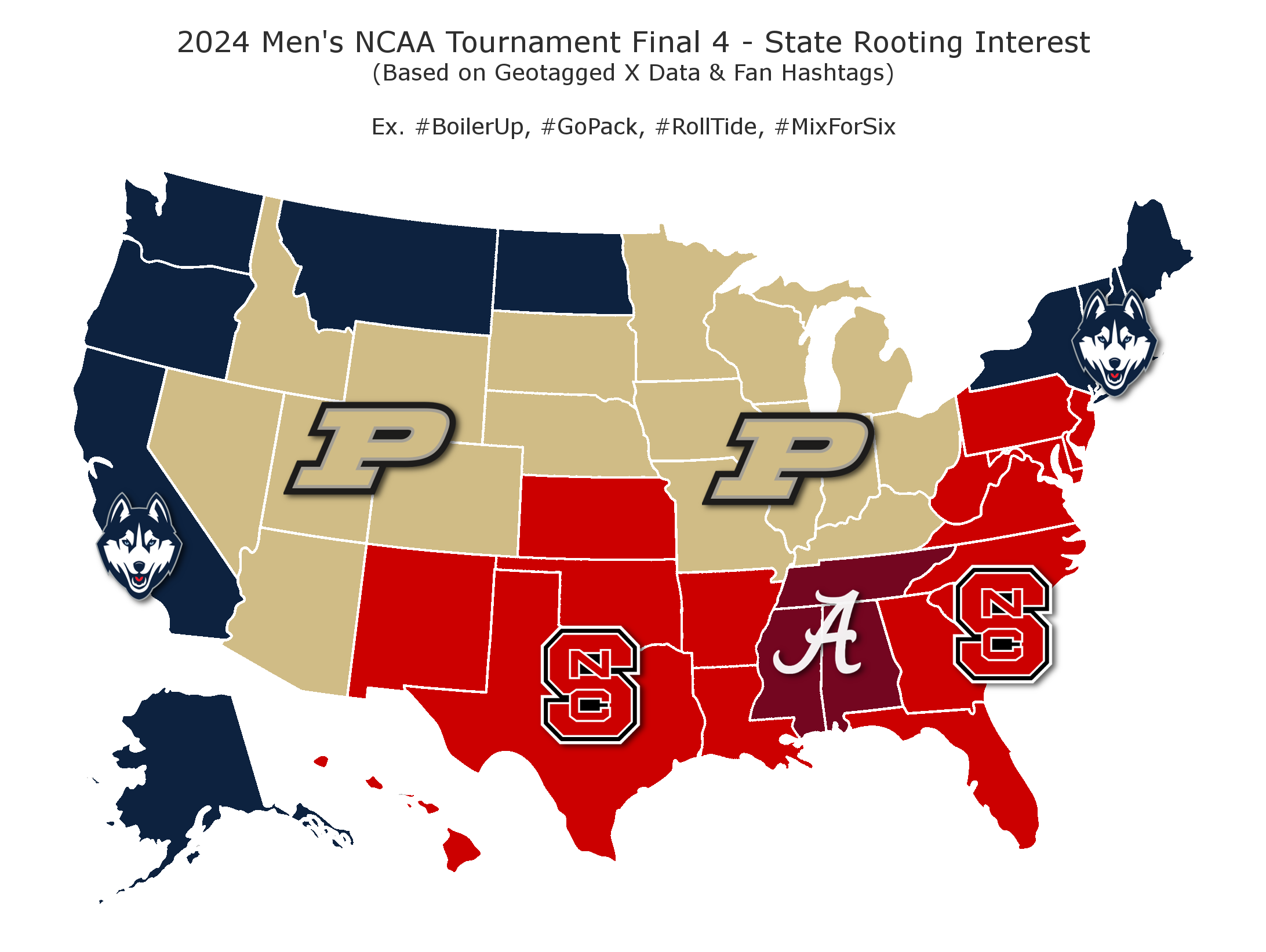 On the men's side, rooting interest is more divided. Purdue and NC State are tied as the favorites with 17 states each, followed by UConn with 13 states and Alabama with three.