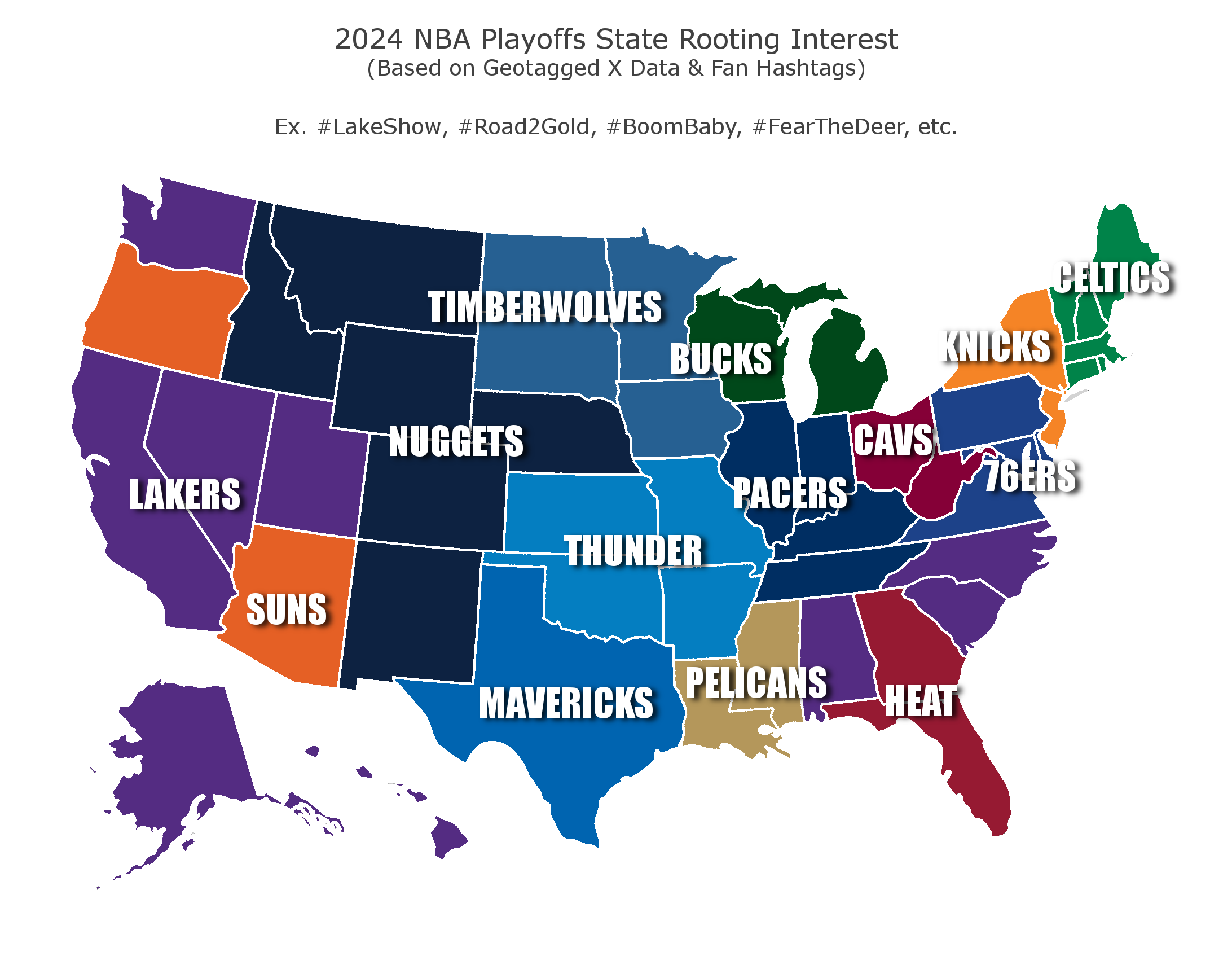 The Los Angeles Lakers, who trail the Denver Nuggets 0-2 in their series, are the most popular team with nine states rooting for them in the playoffs. The Nuggets and Boston Celtics are tied for second with six states, followed by the Minnesota Timberwolves, Oklahoma City Thunder, Indiana Pacers, and Philadelphia 76ers with four states each.