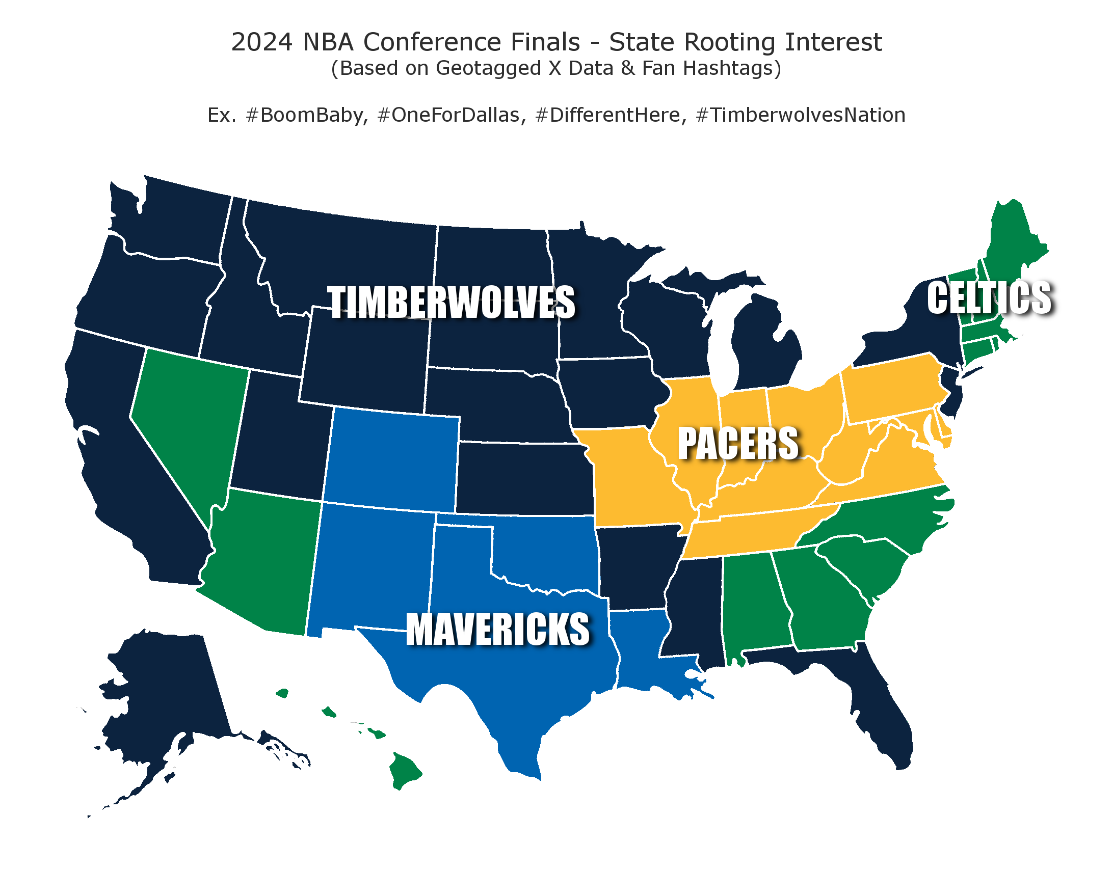 A map created by BetOnline.ag based on geotagged X data gathered since Sunday night, including over 170,000 tweets containing official fan hashtags, shows the Timberwolves are the most popular team in the conference finals, with 21 states wanting them to win their series.