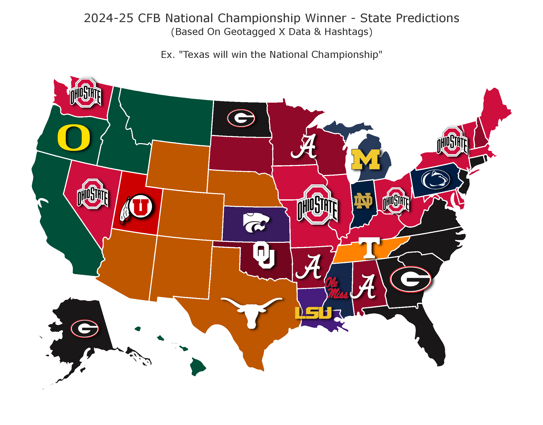 A map created by Betonline.ag based on geotagged X data gathered in the last month, including over 220,000 tweets, shows the Buckeyes favored to win the 2025 College Football Playoff title in 14 states across the U.S., making them the most popular pick overall.