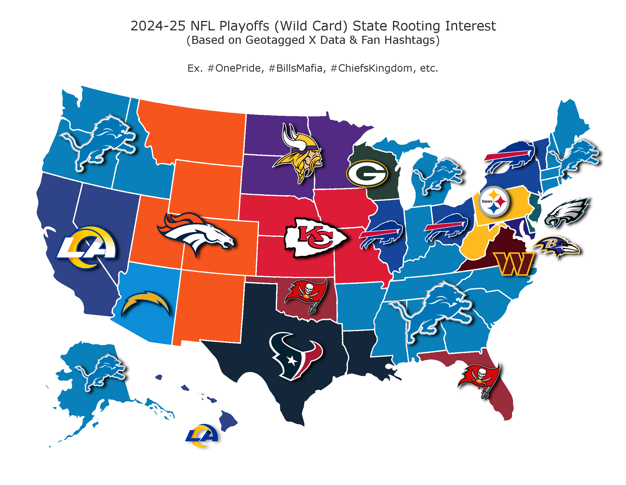 A map created by BetOnline.ag based on over 250,000 tweets gathered in the last week shows the Lions are the most popular team to root for in 19 states across the U.S., making them the favorites heading into the wild-card round.