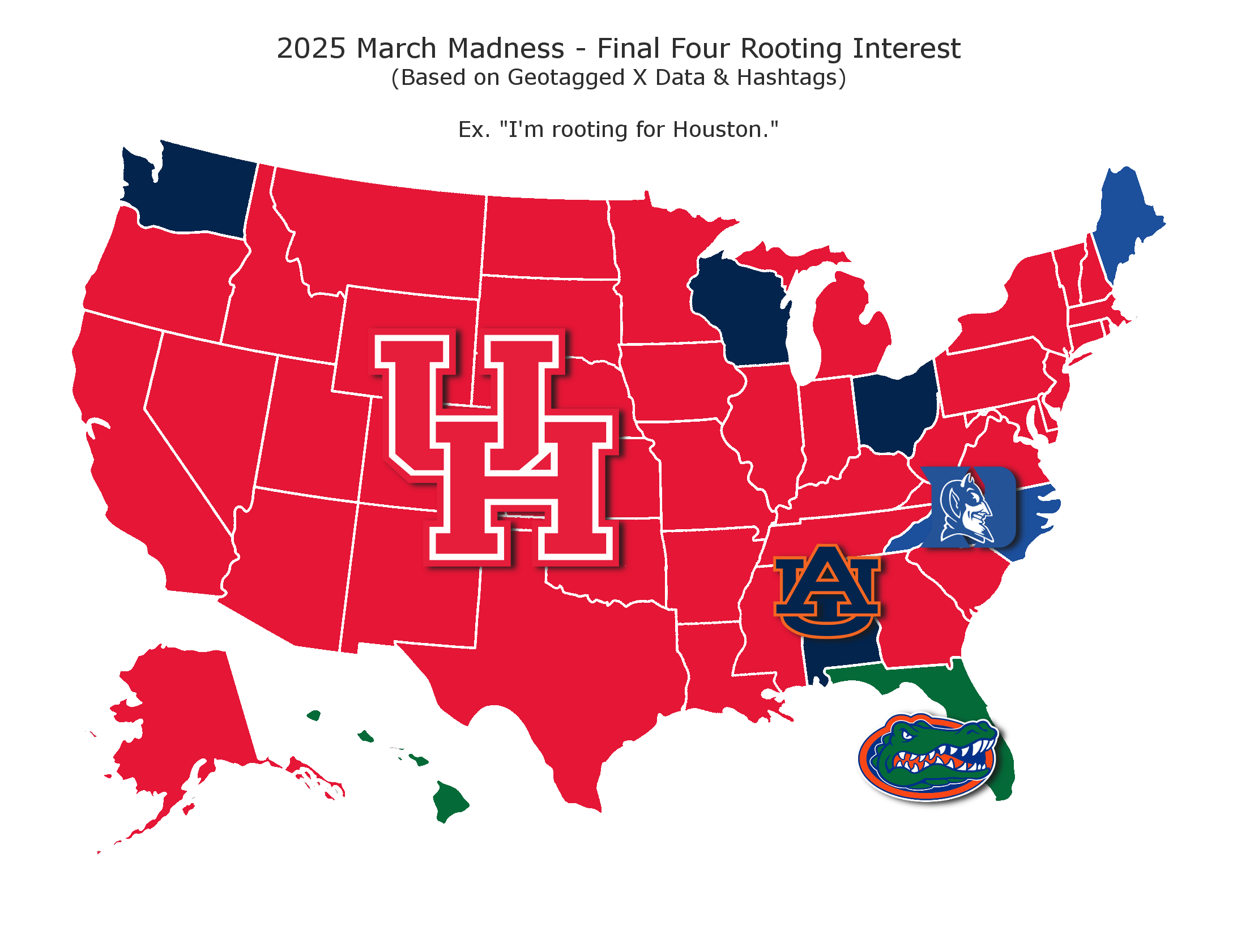 A map created by BetOnline.ag, based on over 130,000 geotagged tweets gathered since Sunday night, shows Houston is the fan favorite in 42 of the 50 states. Auburn had the second-highest rooting interest among the four teams, with four states cheering for the Tigers, while Duke and Florida tied with two states each.