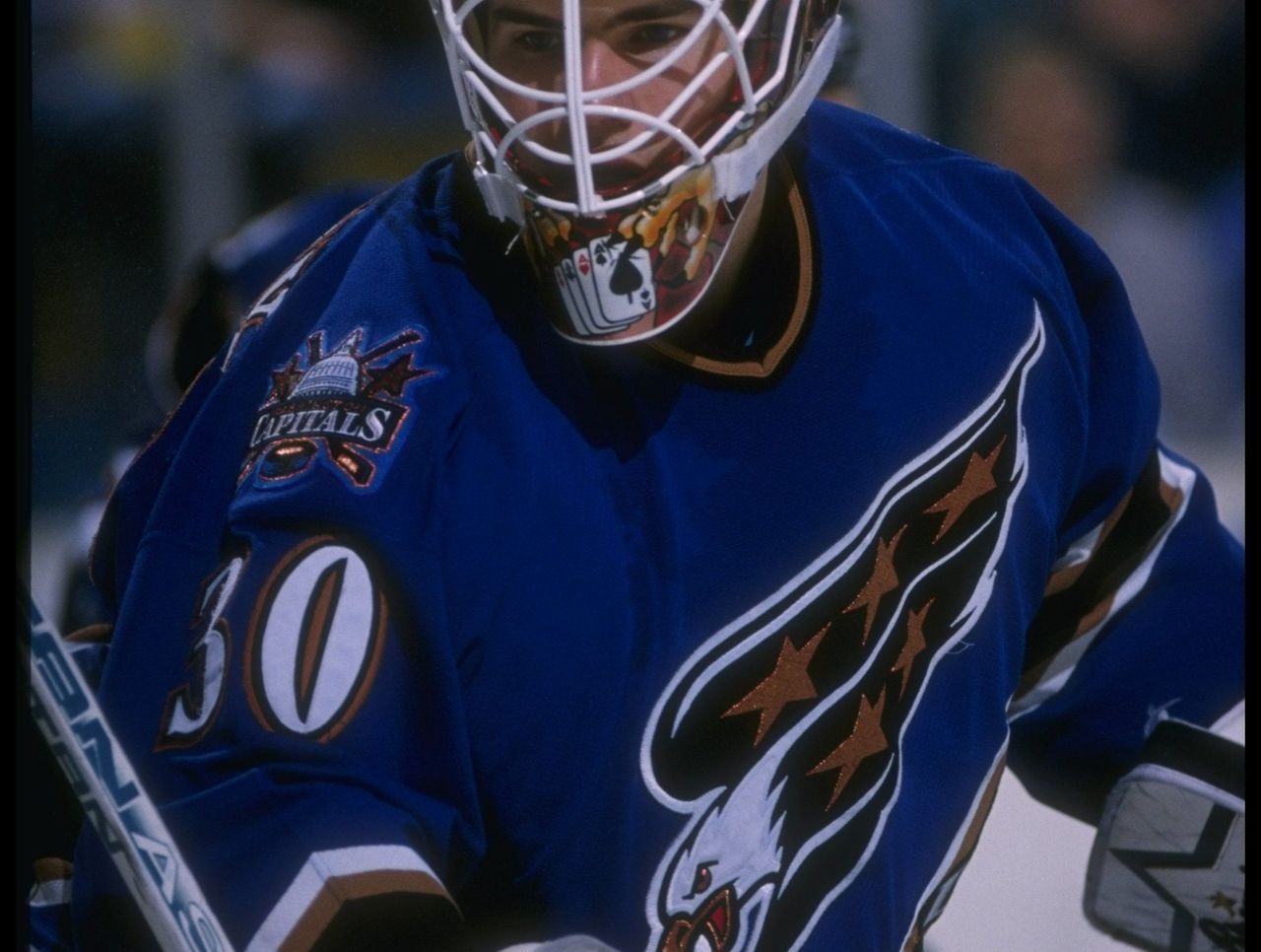 The fibreglass/cage combo gave rise to creative expressionism for goaltenders. While many of the top goaltenders of the 90s went with rather bland looks for the head and face protection (looking at you, Patrick Roy and Martin Brodeur), others preferred to incorporate their own nicknames, team lore, or pop culture references into their masks. Like Ed Belfour (pictured above) who leaned on his "Eagle" nickname and carried the look with him everywhere he stopped, just switching up the colors when needed.