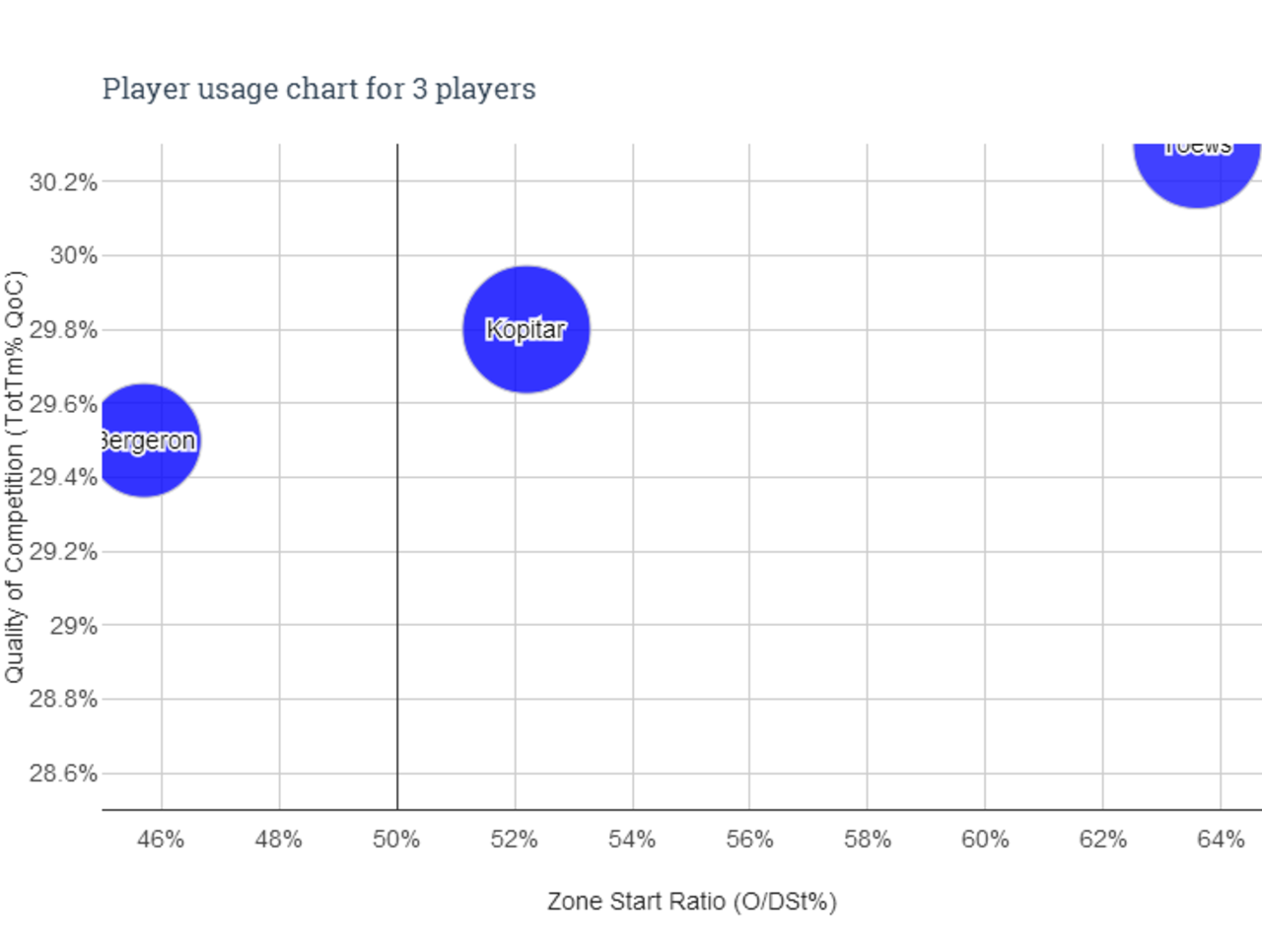 As evidenced in the chart above, Bergeron faced the lowest quality of competition by a slim margin and received the lowest total ice time, but was regularly deployed against top opponents both at even-strength and on the penalty kill (averaging just under two minutes at four-on-five).