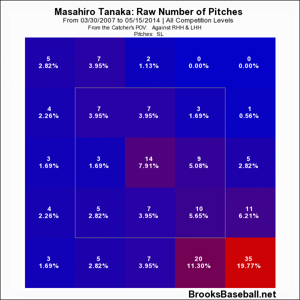 The below diagram shows a zone-by-zone breakdown of every slider Tanaka’s thrown this year from the catcher’s perspective. The hot zone in the bottom corner is typical slider placement against right handed batters. Against lefties, Tanaka throws it on the outside corner, “back dooring” the pitch for a called strike. But it is the slider right down the middle that really stands out.