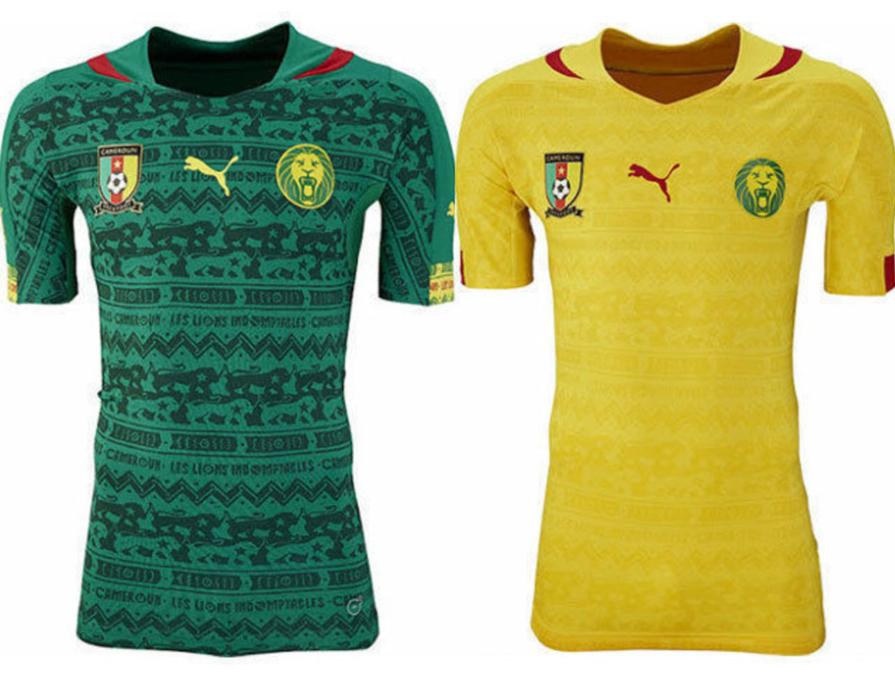 The Cameroonian team will sport green and red uniforms designed by Puma in 2014, the team has always worn these colors when competing in the World Cup. The 2014 edition incorporates a sublimated design on both the home greens and road yellows, this design is based off of cave paintings found in the African nation. This cave paintings pattern continues onto yellow stripes (red on the road) at each arm cuff. The national soccer federation logo is on the upper right, a lion crest representing the team nickname ("The Indomitable Lions") is on the opposite side.