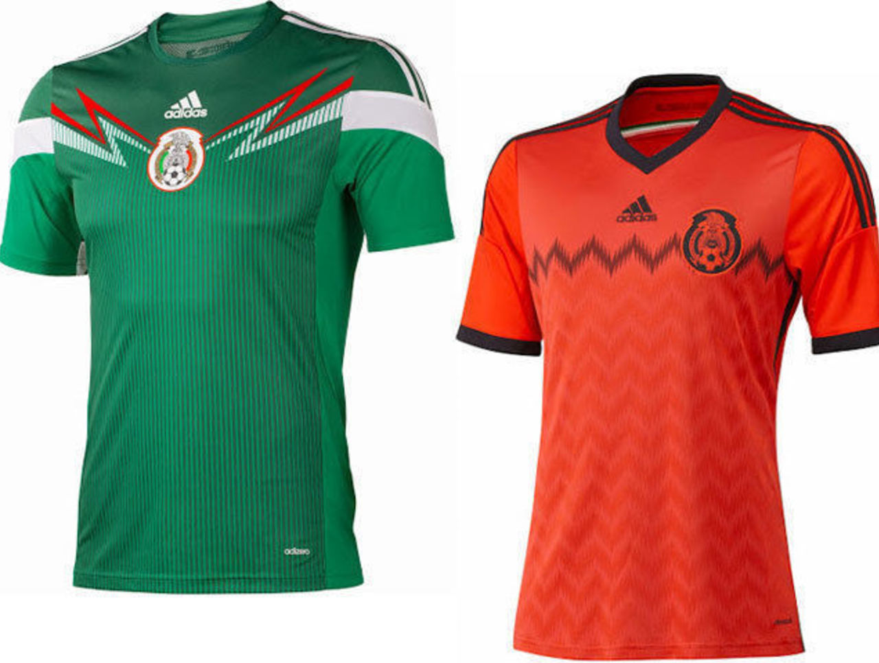 Naturally the team unofficially known as "La Verde" would sport green as it's primary home color in the World Cup, as they've always done, except this time it's a two-toned green, "Dos Verde" might be a more appropriate nickname this year. Also new for 2014 the green home jersey, designed by adidas, features a double red and white lightning bolt design across the front. This is meant to represent the power of the Mexican team. In between either lightning bolt is the Mexican national team emblem and the adidas logo.