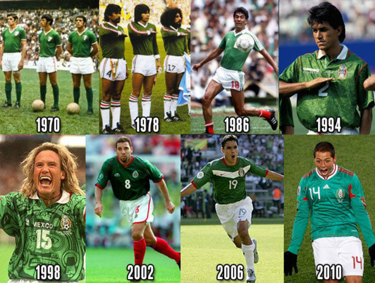 Mexico always wears green, that's just the way it is, but they haven't been afraid to add designs to the green jersey over the years. In 1994 they introduced a sublimated Aztec design to the jersey, which they increased to the extreme in 1998 before returning to a more simple look in 2002. In 2006 a white stripe was added across the front for just that tournament. You'll notice 1990 is missing up there, the Mexicans were banned as punishment for fielding an overage player in an unrelated FIFA youth tournament.