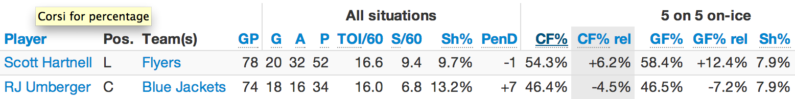 Umberger may have scored 18 goals this past season while Hartnell had 20, but they’re nowhere near equal players. Umberger had his highest shooting percentage since 2005-06 to get there, while Hartnell had his second-lowest shooting percentage in the past decade. Hartnell’s tallied about 40 more points over the past three seasons - in fewer games. If you wanted to dig deeper and look at their advanced statistics, it gets more obvious, and isn’t really a debate.
