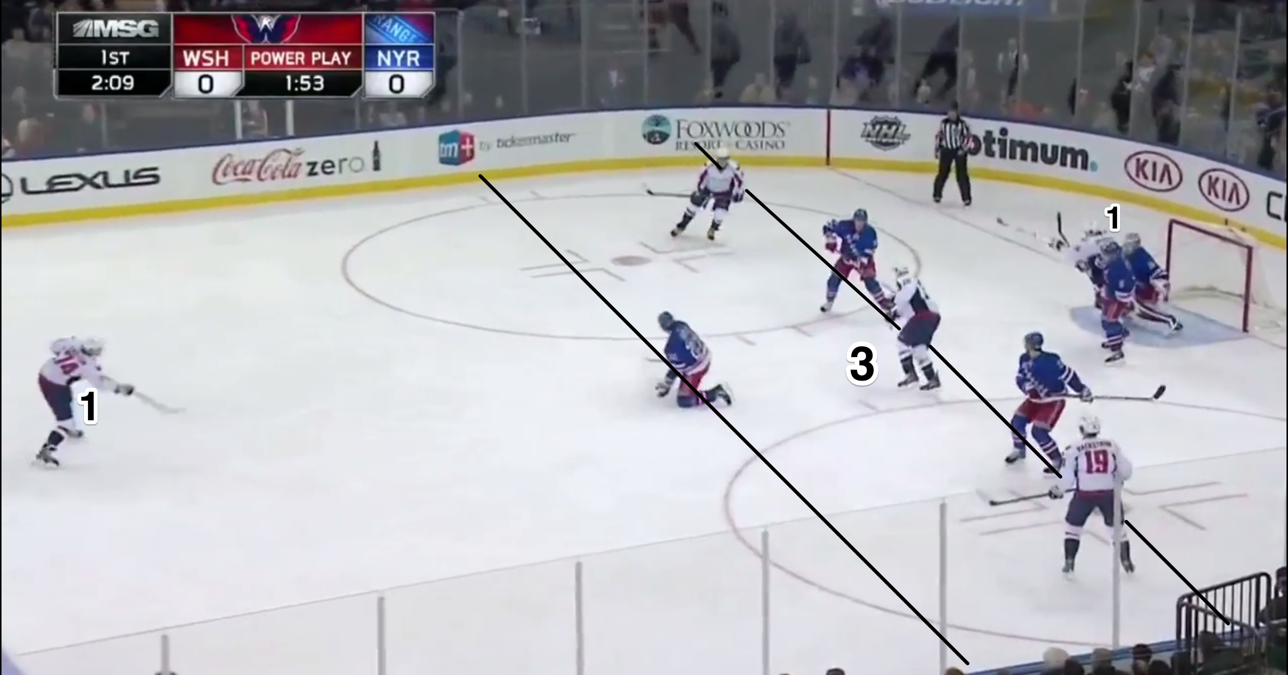The Capitals power play sets up in a 1-3-1, and runs everything off the right side. That’s the equivalent to a magician using a sightly assistant and pyrotechnics to distract you while he gets his hat-rabbit ready.