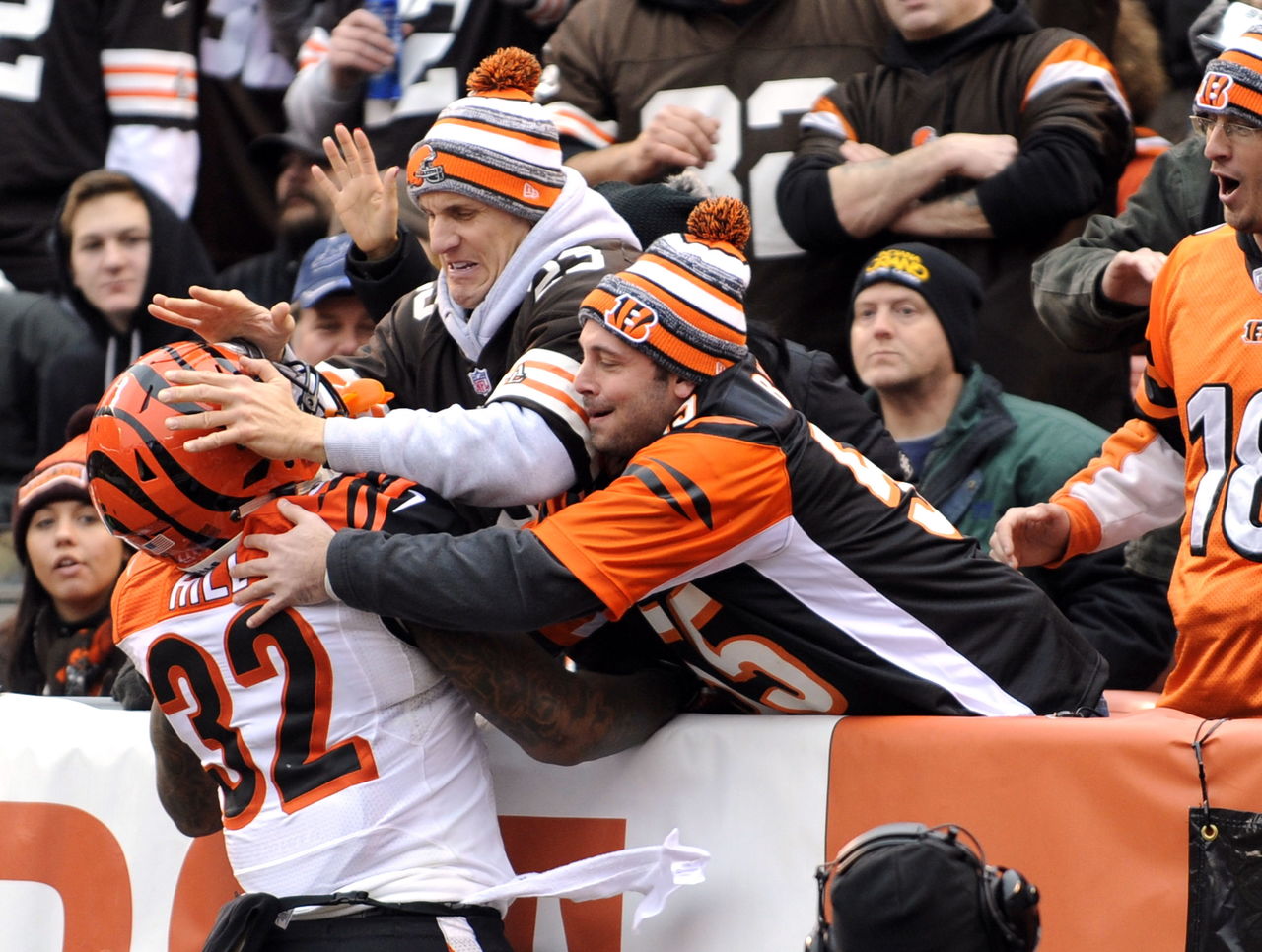 Jeremy Hill being simultaneously loathed by a Browns fan and embraced by a Bengals fan is rife with drama. It's fairly straightforward metaphorical imagery. To extend the metaphor, look at the sad Jaguars fan on the right watching the other franchises passionately compete.