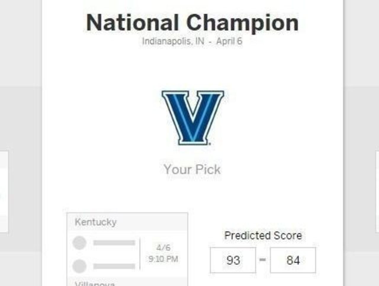 Kermit has set up a top-seed Wildcats showdown as his NCAA tournament final, with Villanova defeating powerhouse Kentucky 93-84. Entering the tournament hot on a 15-game victory march, Villanova has a good chance to take it all. The most interesting thing about this bracket is Kermit has Xavier sailing through to the Final Four. The Musketeers aren't exactly the picture of a strong team, finishing 9-9 in the Big East, but Cinderellas happen.