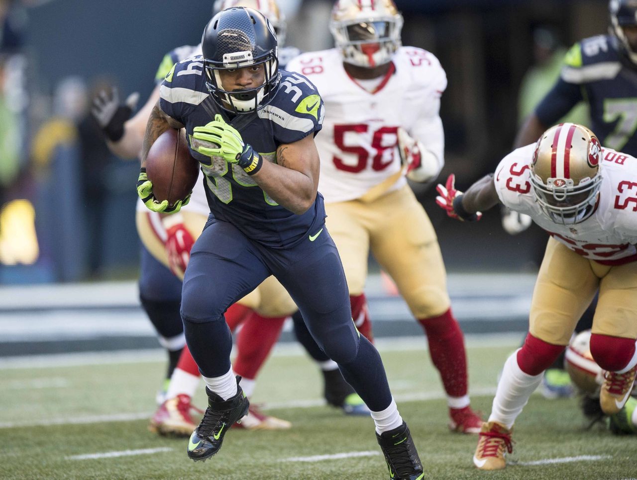 Rookie Thomas Rawls (above) has outrushed Lynch 604 yards to 417, despite only receiving 101 carries to the veteran's 111. Rawls had a big game Sunday with the workload all to himself, totaling 255 combined yards and two TDs.