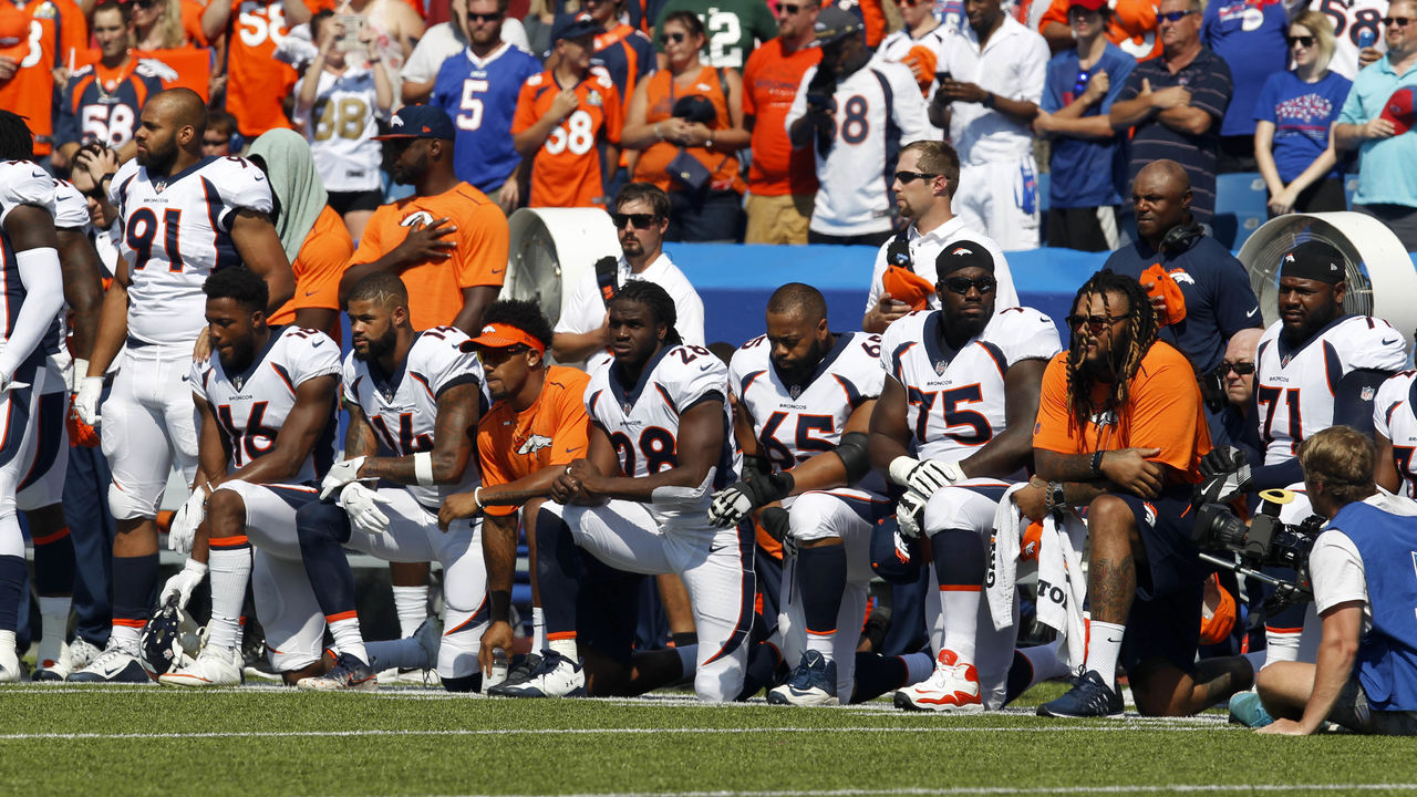 Among the Broncos who took a knee were stars Von Miller and Brandon Marshall. Corner Chris Harris raised a fist in the air.