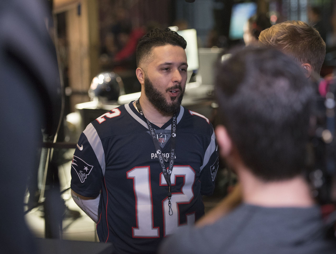 Playing five-minute quarters on the Xbox One, Khan falls behind 10-0 in the first quarter and needs a touchdown with less than three minutes left in the fourth quarter to even the score at 21. An interception on the ensuing possession proves costly for Booth, as Khan takes advantage and kicks a game-winning field goal as the clock hits zero. Khan lets out a sigh of relief. He has narrowly escaped an upset.