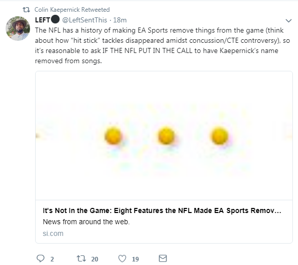 As revealed by Mike Florio of Pro Football Talk, Kaepernick's name was also scrubbed from a song in Madden 18. It's unclear if this, too, was a rights issue.
