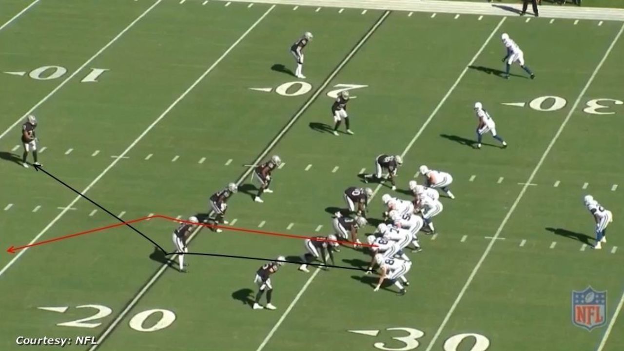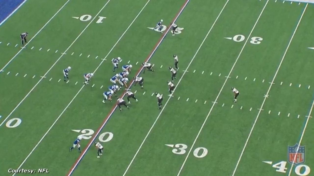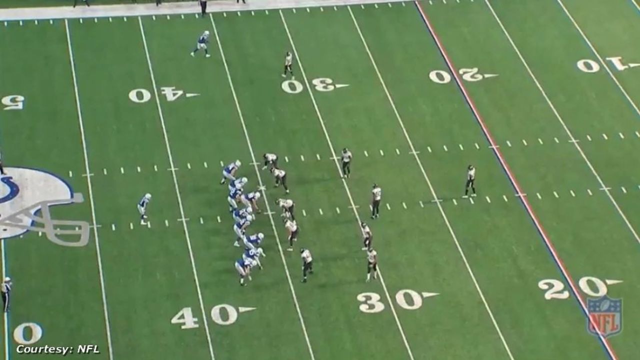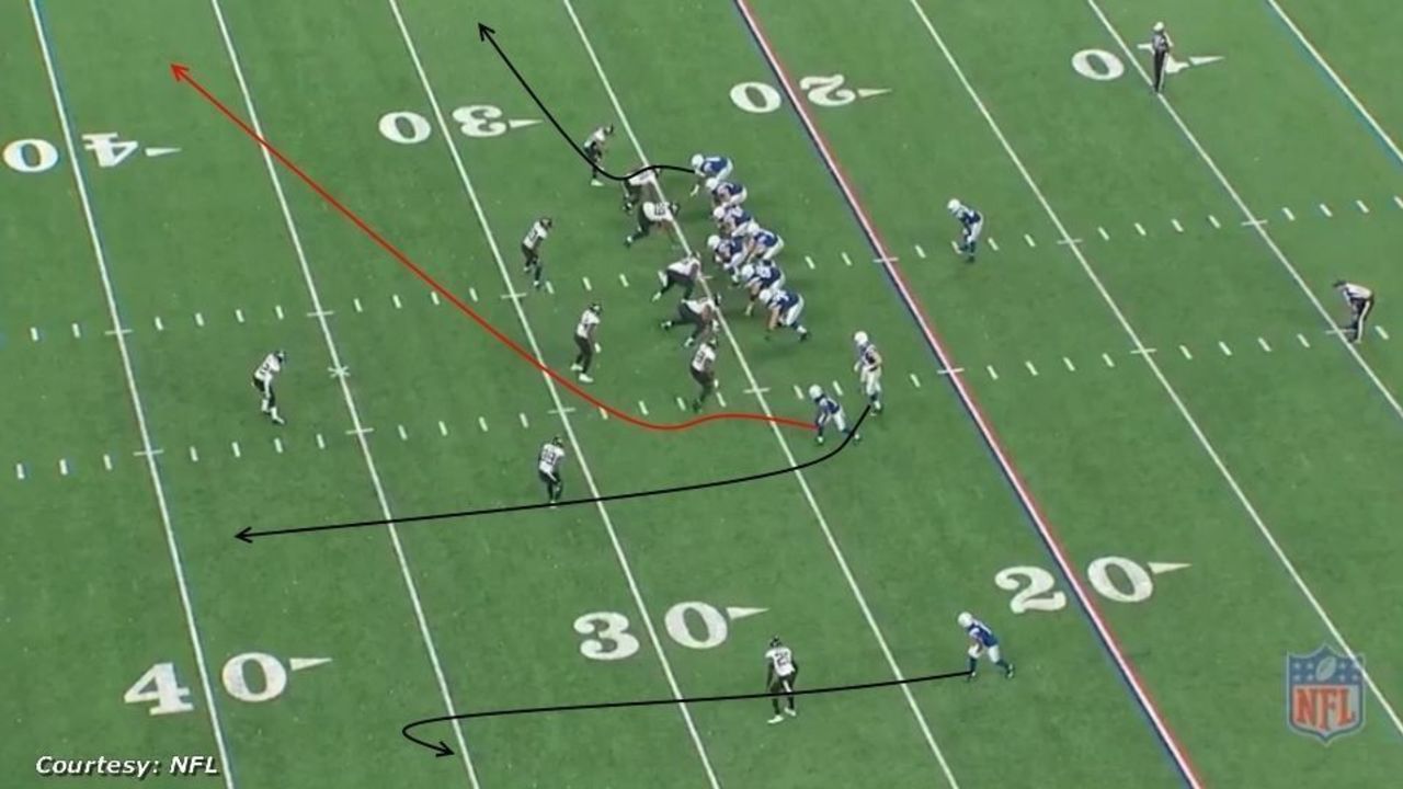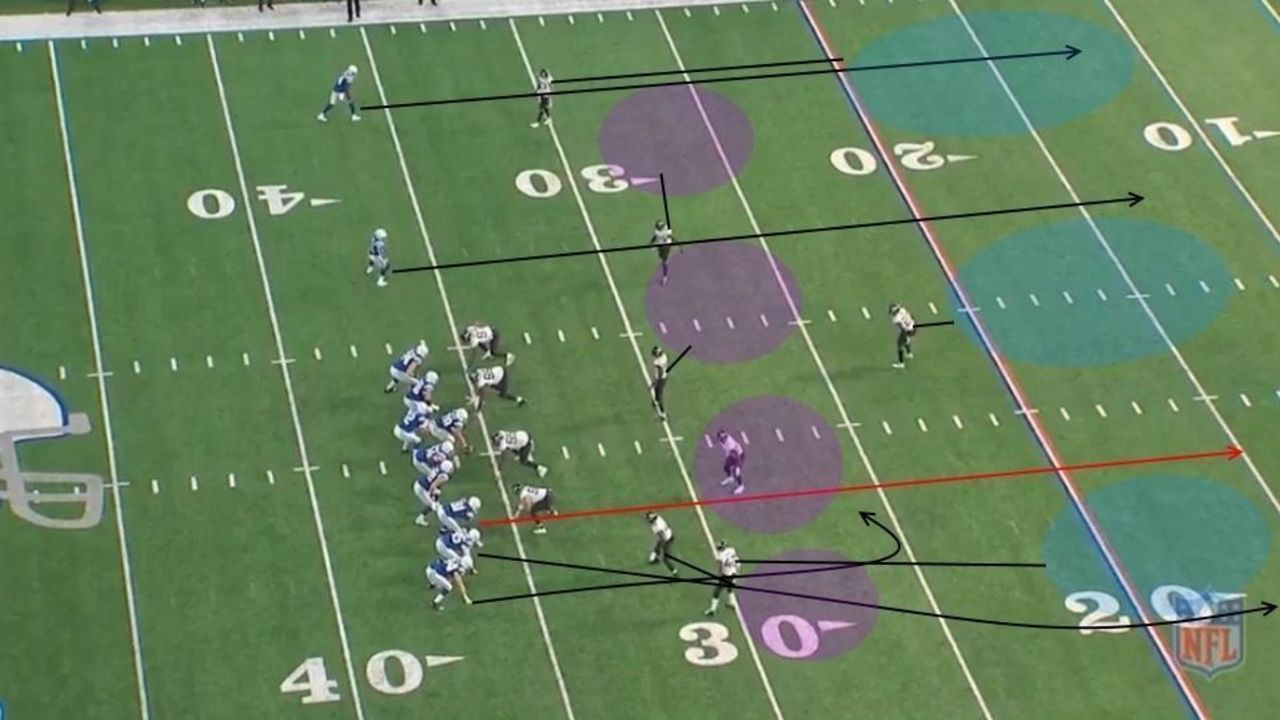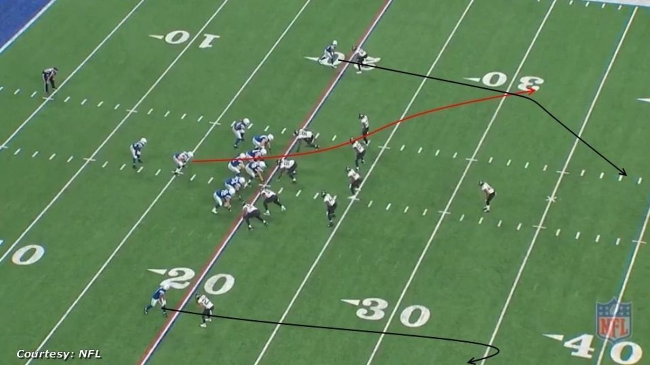 Indianapolis runs a "scissors" concept, a vertical passing play with a deep post route and a corner route.