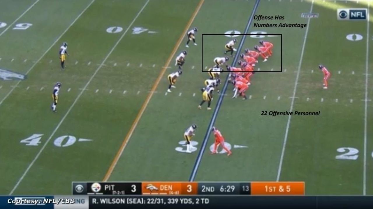 The success of this play begins with the formation and personnel. The Broncos break the huddle with one wide receiver, two backs, and two tight ends - known as 22 personnel - with both tight ends and fullback Andy Janovich (No. 32) on the right, giving them a huge numbers advantage on that side of the field: