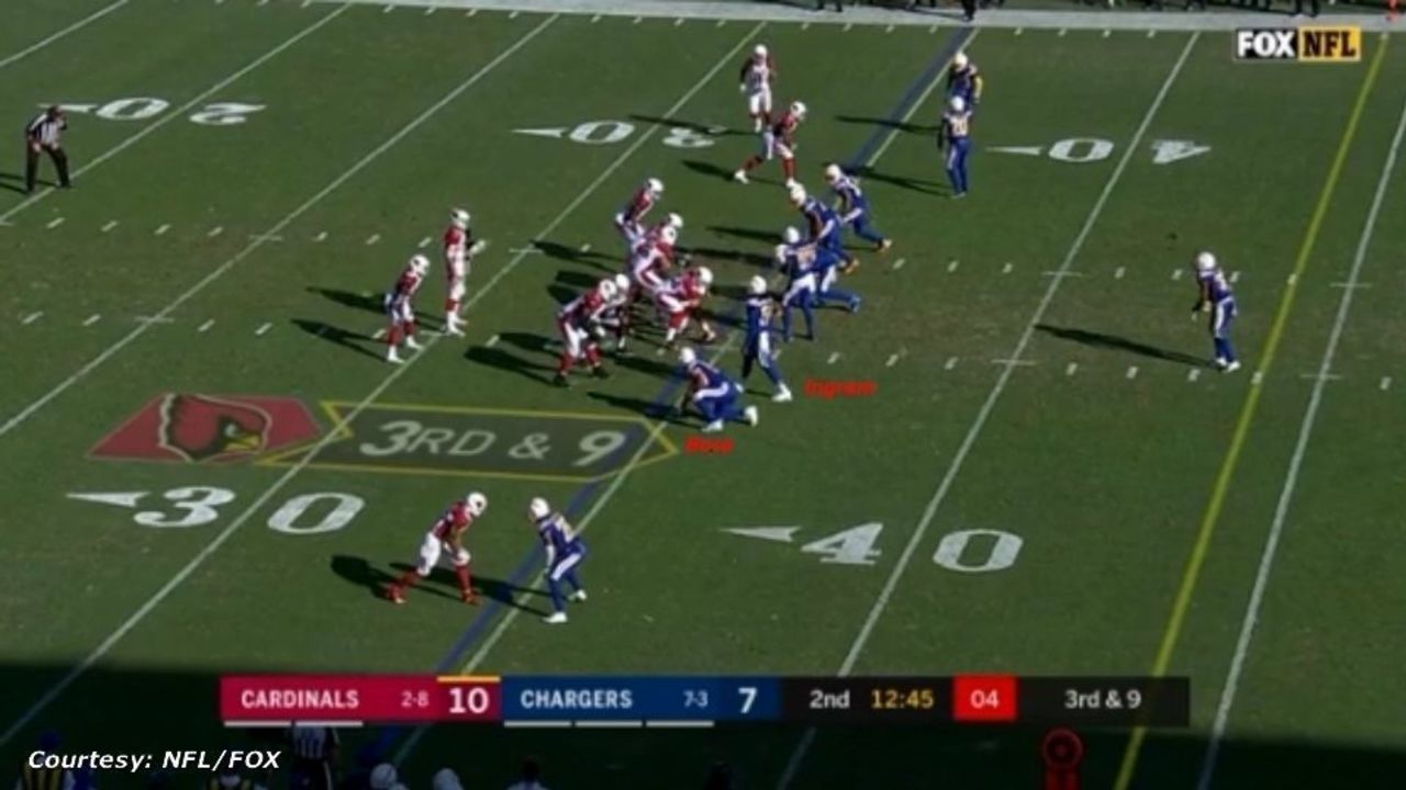 One of those sacks came early in the second quarter on a third-and-9 in Cardinals' territory. With Rosen lined up in the shotgun, the Chargers turn to two of their pressure concepts. First, they show blitz with both linebackers. Next, they put pass-rusher Melvin Ingram just inside of Bosa - who's on the end - which means their two best pressure players are on the same edge:
