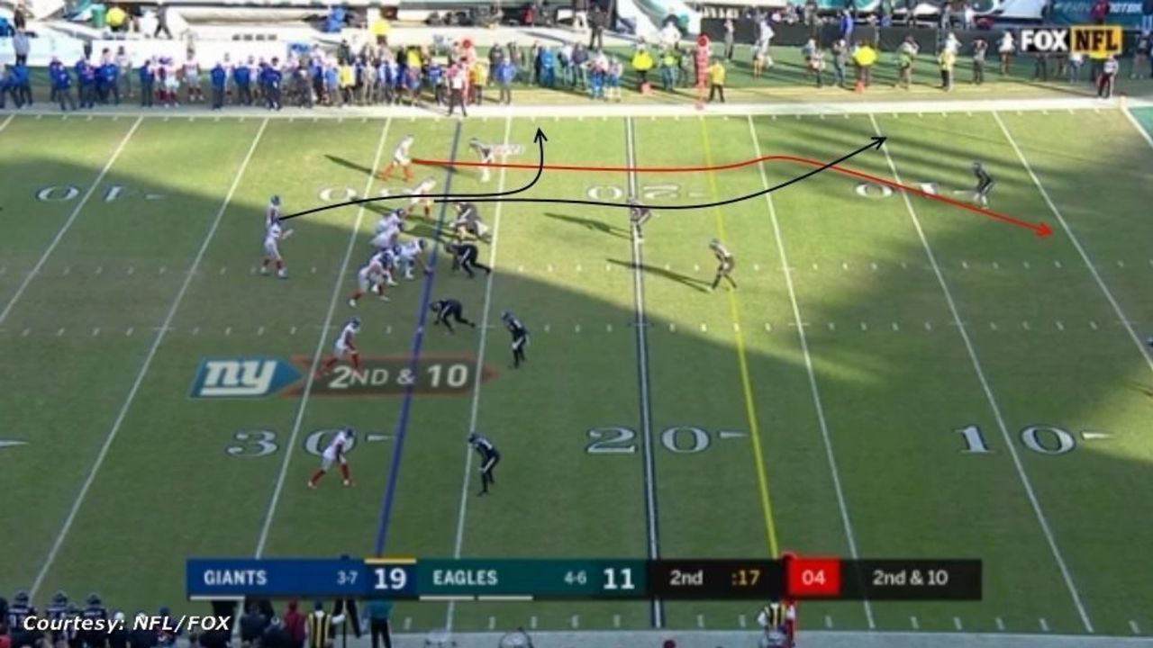 The play begins with just 17 seconds remaining in the second quarter and the Giants facing a second-and-10 at the Eagles' 37-yard line. Eli Manning's in the shotgun and looking for Odell Beckham Jr. to run a post route (red arrow):