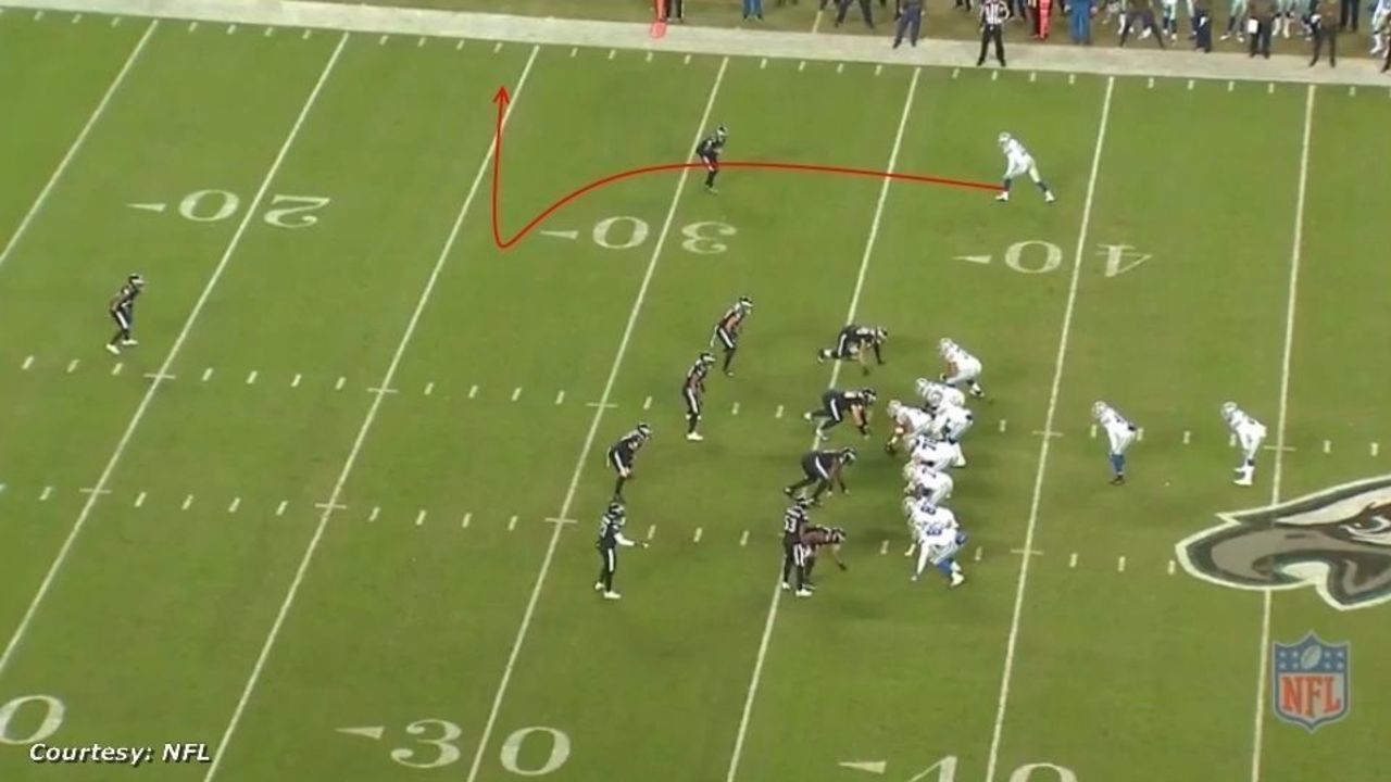 On this first play, Cooper (lined up at the top of the image) runs a simple out pattern against Ronald Darby of the Philadelphia Eagles:
