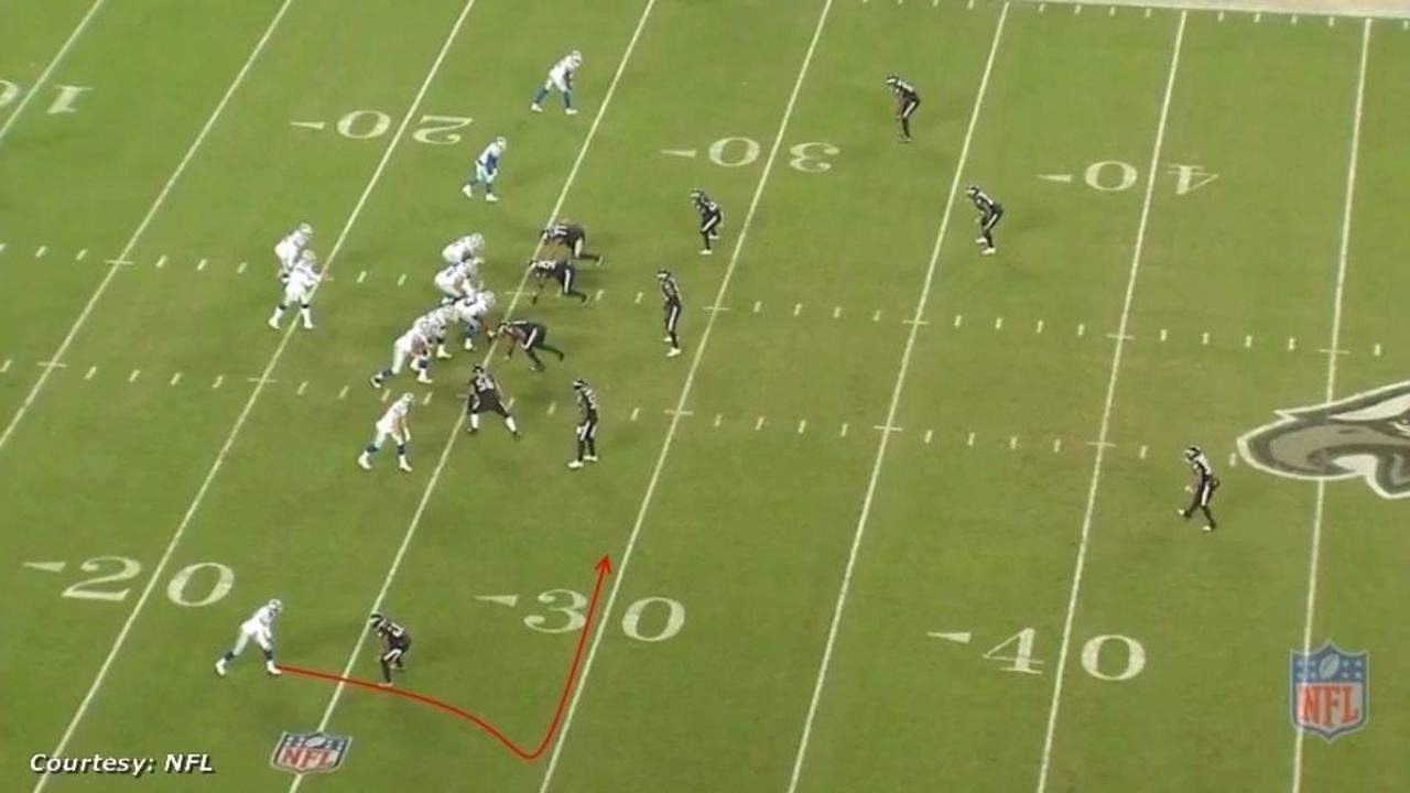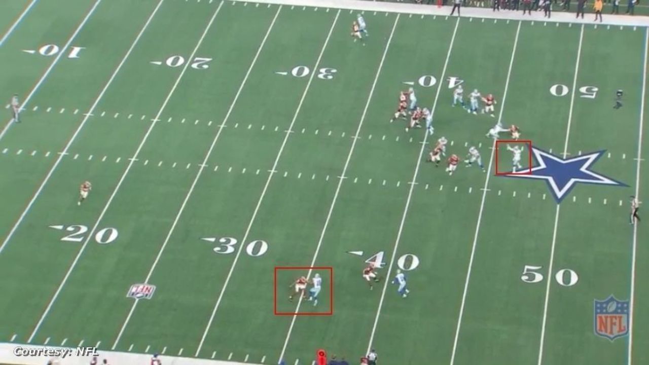 This is known as the defender "flipping his hips" the wrong way, which we'll see on a number of Cooper's routes. Here, it creates the separation and gives Prescott an easy target for the first down.