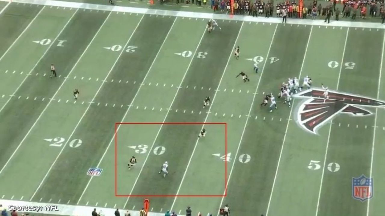 As in the previous play, Cooper sells the vertical release perfectly, and when Darby flips his hips to the sideline to start running with a deep route, the receiver cuts underneath him with precision: