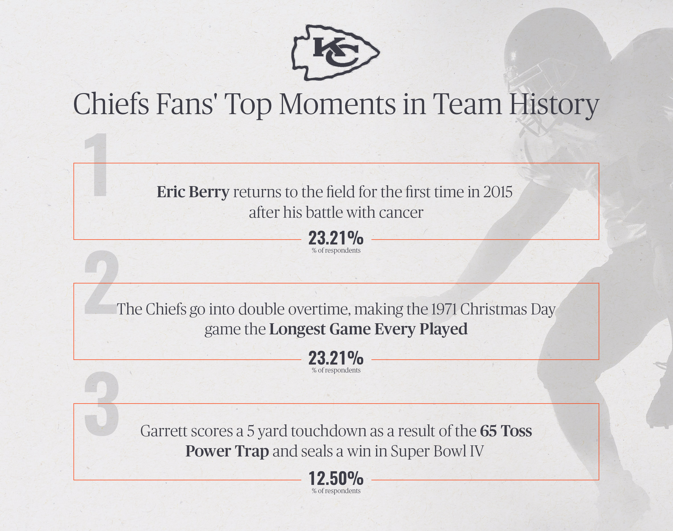 Eric Berry's first game back after battling cancer and the Chiefs' double-overtime thriller on Christmas Day in 1971 tied for Kansas City's top moment at 23.21 percent.