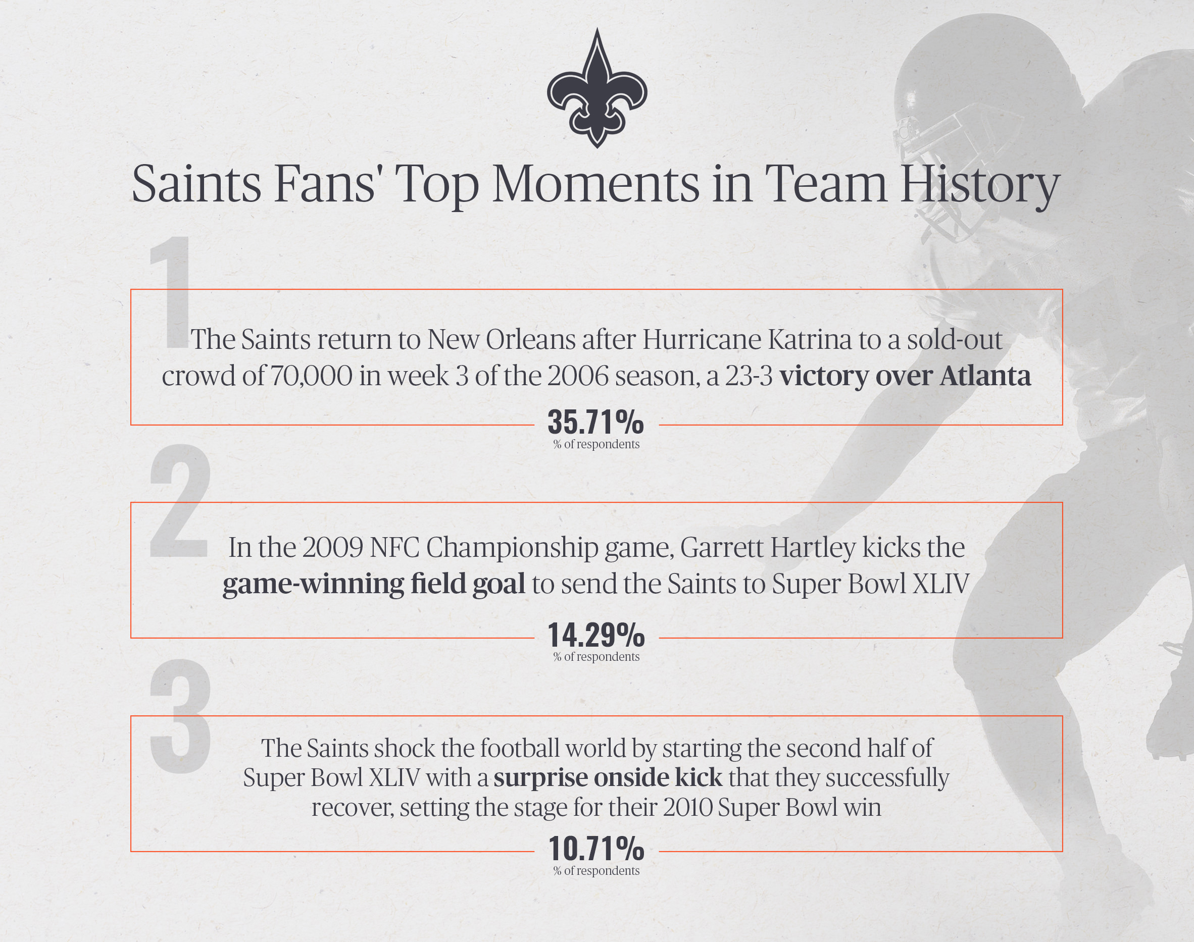 35.71 percent of New Orleans Saints fans said their favorite moment was the team's return to the Superdome following Hurricane Katrina in 2006.