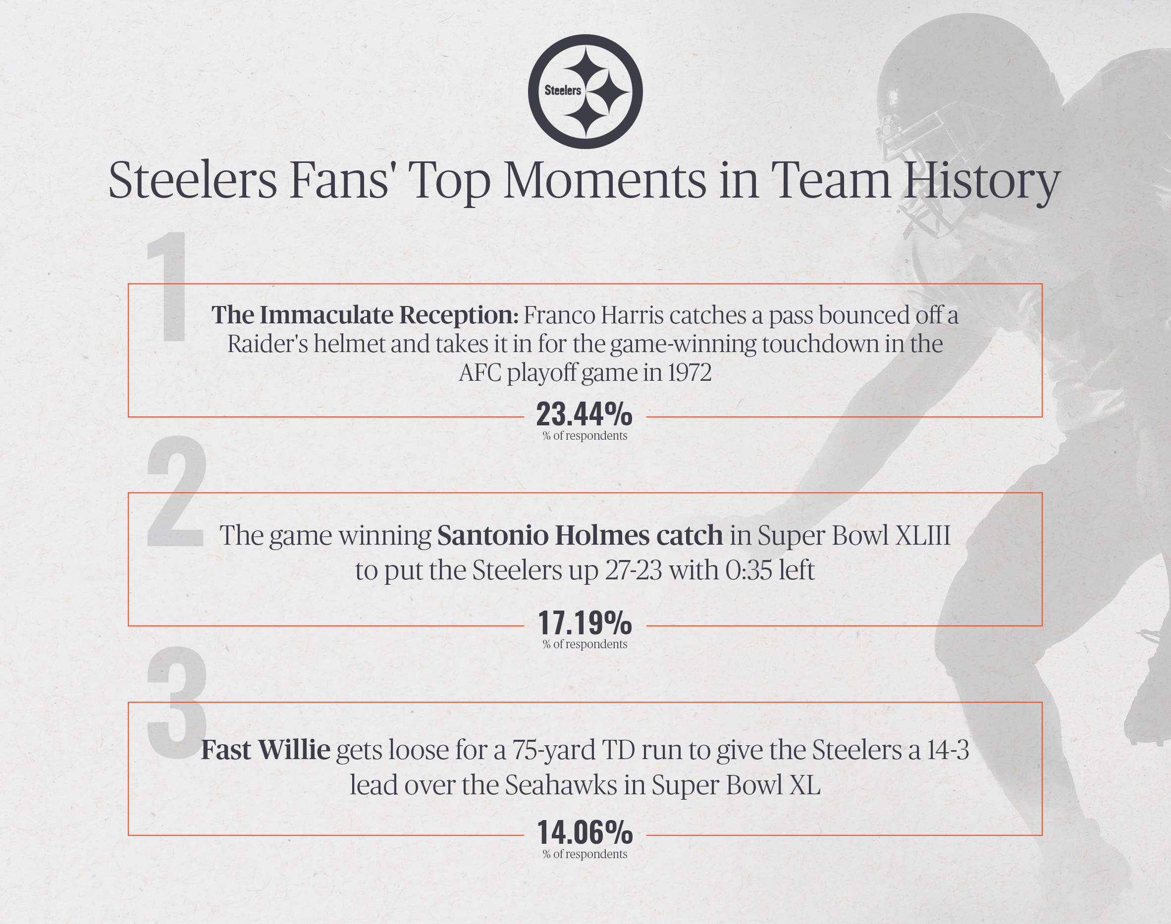 The Pittsburgh Steelers' "Immaculate Reception" from the 1972 AFC divisional-round game was chosen as their top moment with 23.44 percent of votes.