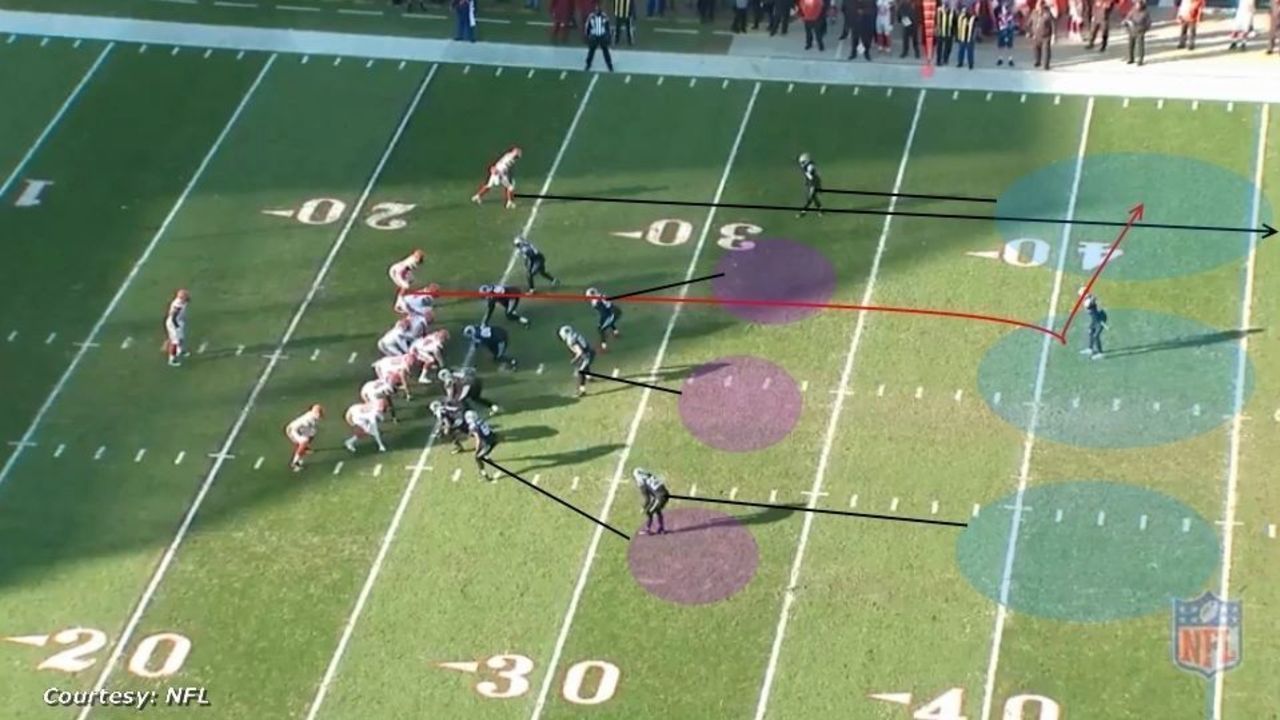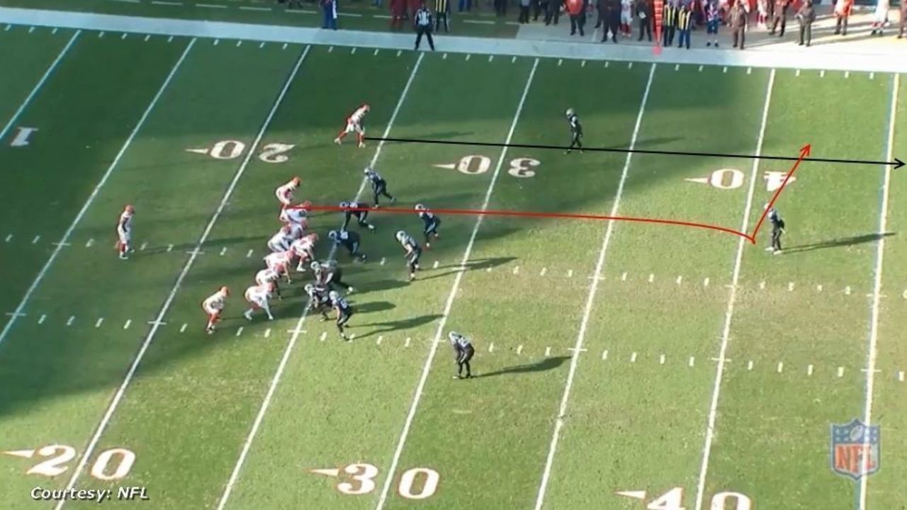 The Browns run a vertical passing concept often termed "989." Cleveland has a vertical route on the outside to both sides of the field - the "9" routes - while Jarvis Landry runs the post route in the middle of the field. The Panthers run a Cover 3 scheme, with the free safety shaded toward the two-receiver side of the formation.