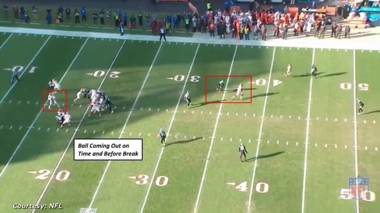 What stands out here is the anticipation on the throw. Mayfield was not known as a great anticipatory thrower coming out of Oklahoma, though he might have been sold short in that category. Here, he confirms the defense post-snap and pulls the trigger well before Njoku's break: