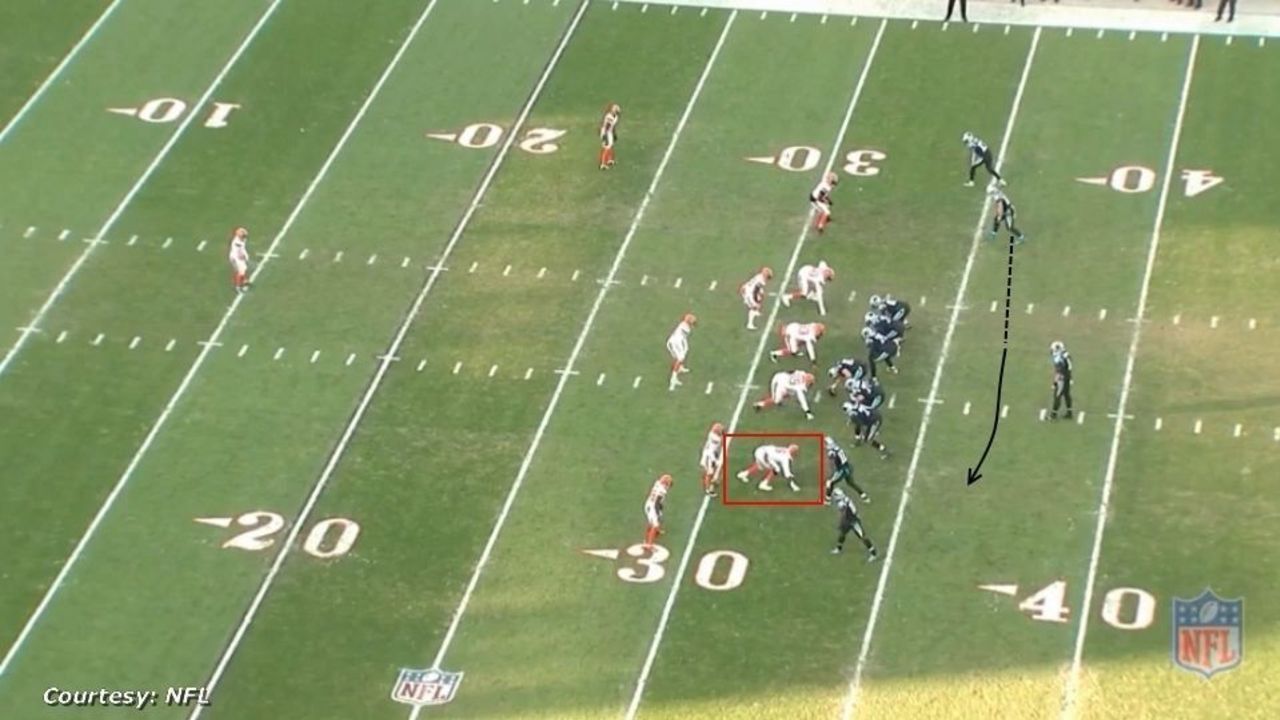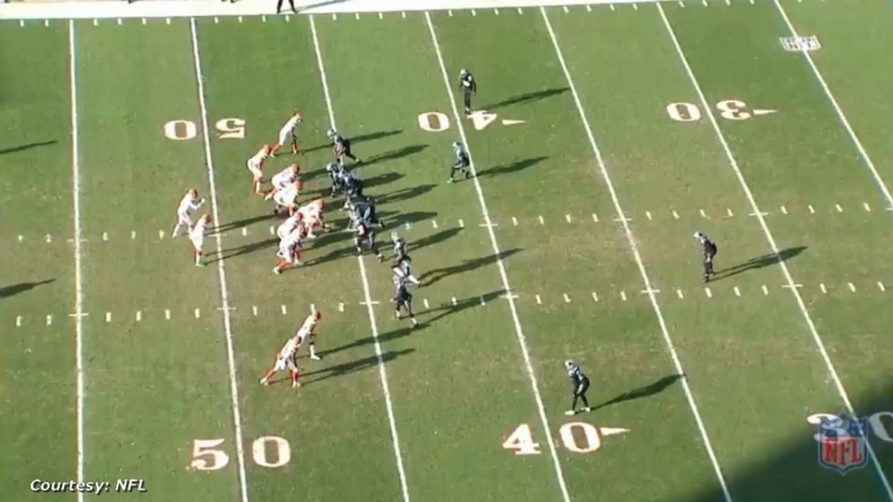 Cleveland has the football just inside Carolina territory, on a third-and-9 situation, and is looking to erase the Panthers' three-point lead. But it needs to convert this pivotal third down. Mayfield is in the shotgun and the defense shows pressure up front. He can't decipher which defenders are coming after him, if any. He'll need to trust the blocking up front and potentially hang in the pocket as it collapses to move the chains on this long-yardage situation.
