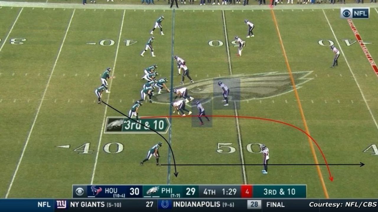 Philadelphia catches the Texans in man coverage here, and as linebacker Zach Cunningham tries to blanket running back Darren Sproles on his swing route, he runs into safety Tyrann Mathieu, who is covering Ertz. The two defenders collide, freeing up the tight end for the game’s critical play: