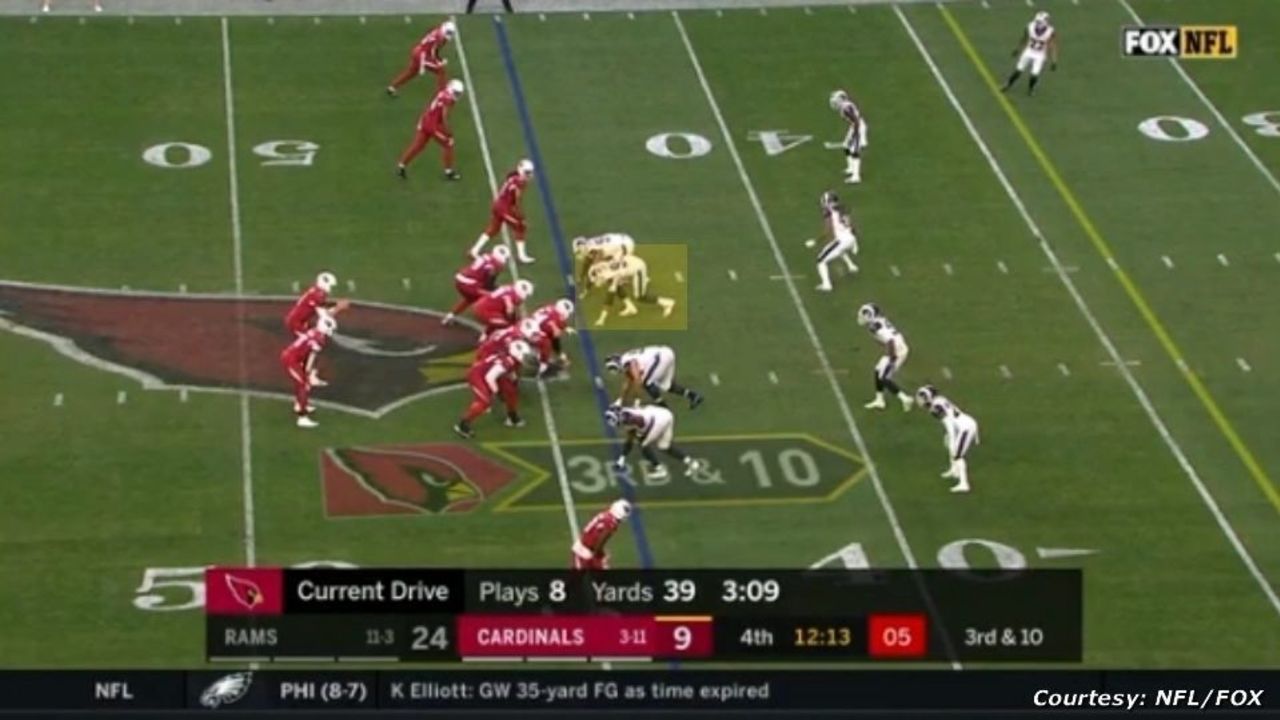 Donald is untouched as he angles behind his teammate, and Rosen has no choice but to cover up the football.