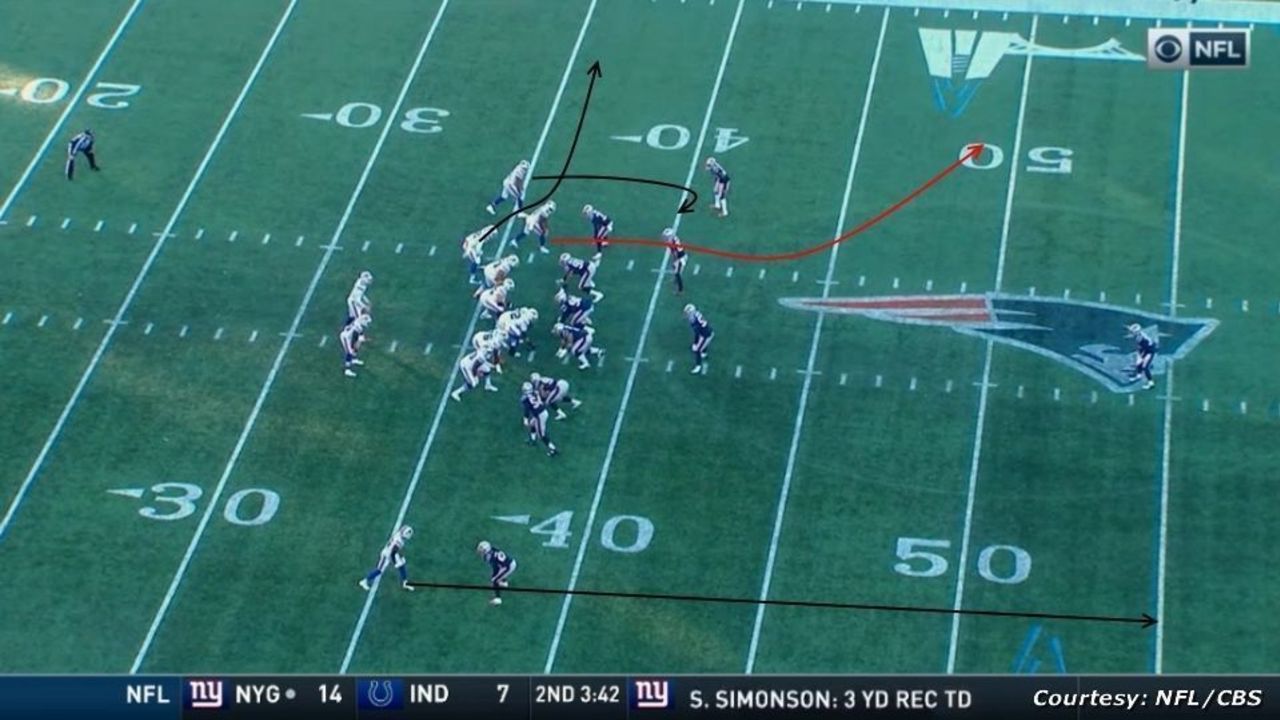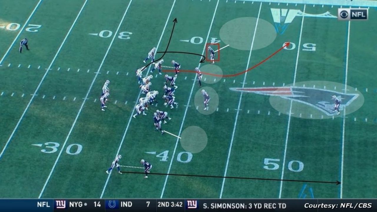 Gilmore is left alone on the backside and is in “MEG,” or “Man Everywhere he Goes” coverage on his receiver. To the rest of the formation, the Patriots run a pattern matching Cover 3. Jackson - highlighted by the red box - is responsible for the deep outside, but as the play begins, he sees the two receivers on the outside running shorter routes, and reads the corner route from the intended target, Deonte Thompson. Cornerback Jonathan Jones is trailing Thompson in a pattern-match scheme, essentially covering him in man coverage. Jackson studies the eyes of the quarterback and drops under the pass: