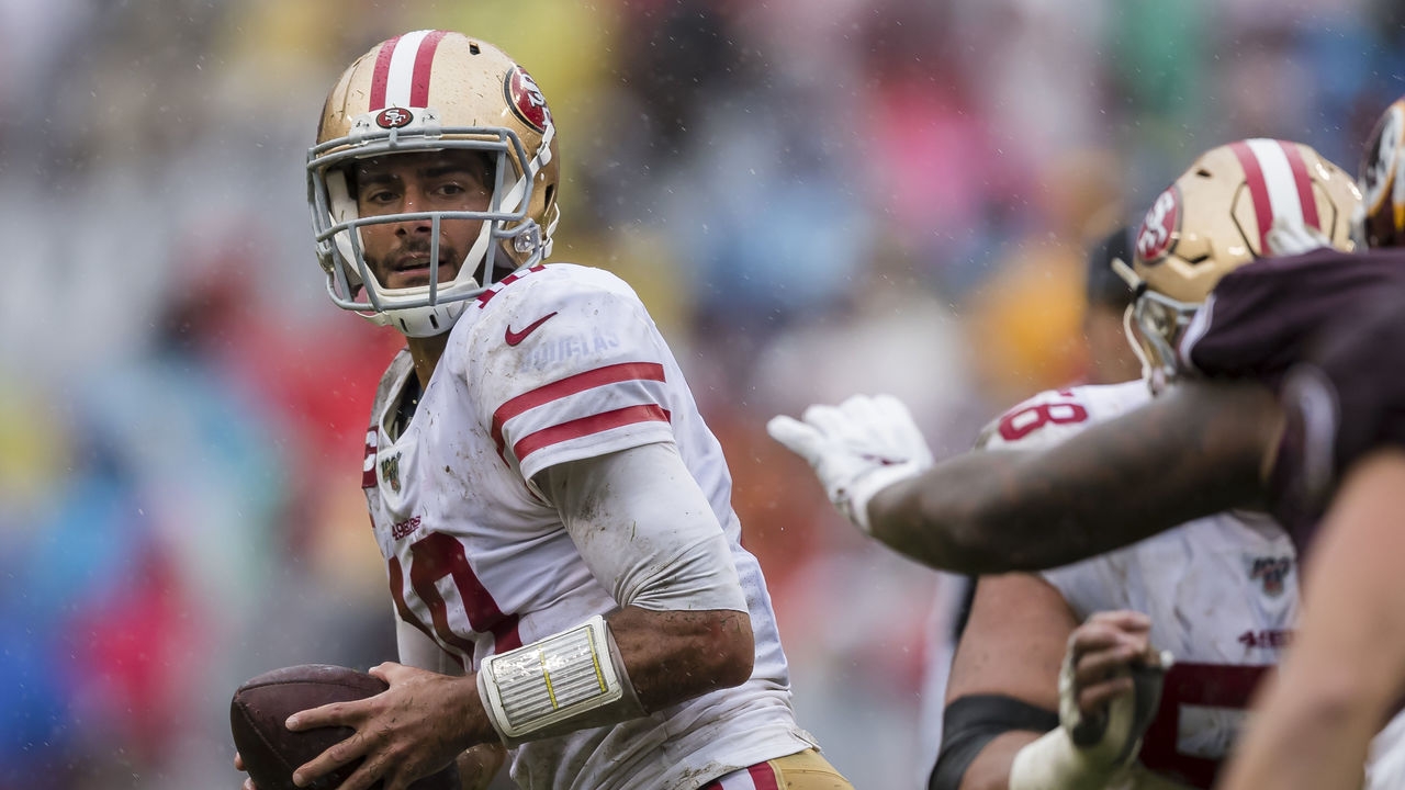 Kyle Shanahan's 49ers failed to score a touchdown against his former team in Washington, yet still managed to improve to 6-0 on the season. Sloppy weather didn't set Jimmy Garoppolo up for success, but he missed throws and made several poor decisions, ultimately going 12-for-21 with one interception. The 49ers are succeeding on the strength of their defense and rushing attack, but Garoppolo's play is becoming alarming. The losses will start coming if he can't turn things around.