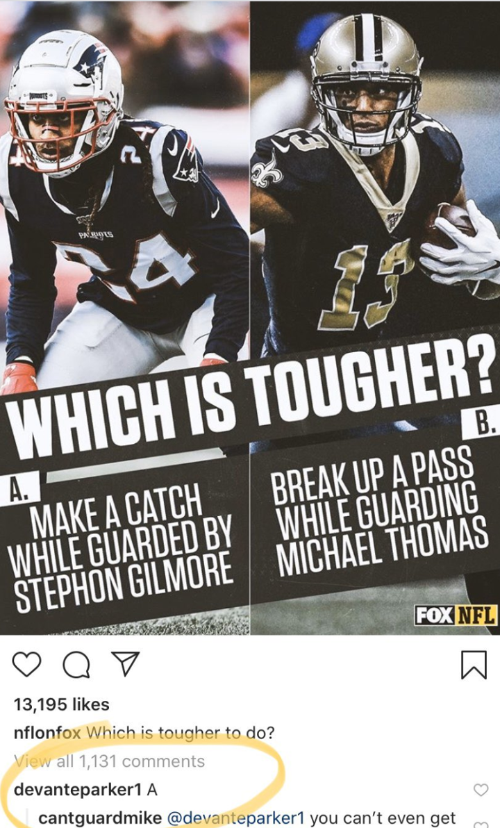 Answering a question posed by the NFL on Fox Instagram account about whether it's harder to make a catch while being guarded by Stephon Gilmore or to break up a pass intended for Thomas, Parker picked his AFC East rival, whom he torched for 137 yards in Week 17 last season.