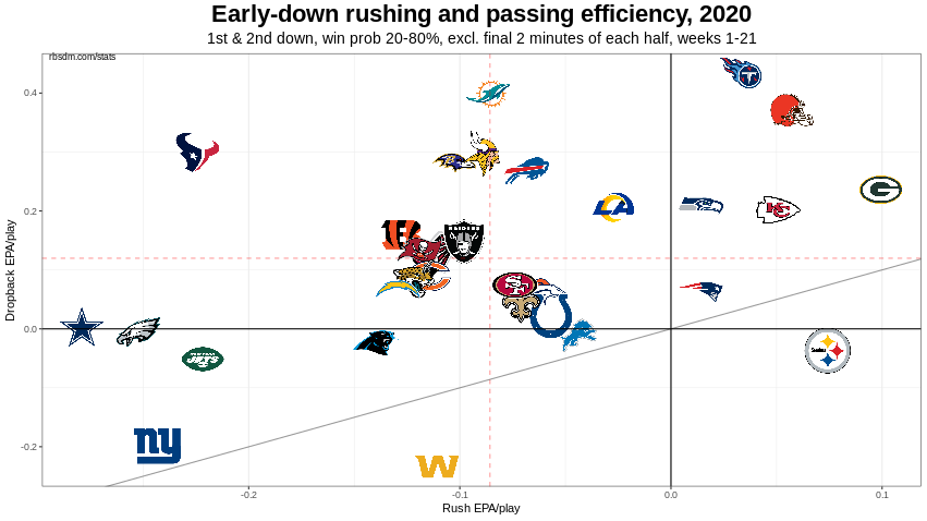 Teams are becoming increasingly pass-heavy on early (first and second) downs, and while the Titans are not one of them, Tannehill is extremely efficient when he does throw in those situations. According to Ben Baldwin's database, the Titans rank 31st in early-down pass rate (45.6%), but Tannehill's expected points added (EPA) per play on first- and second-down dropbacks is 0.434, which is the best in the league, as this chart demonstrates: