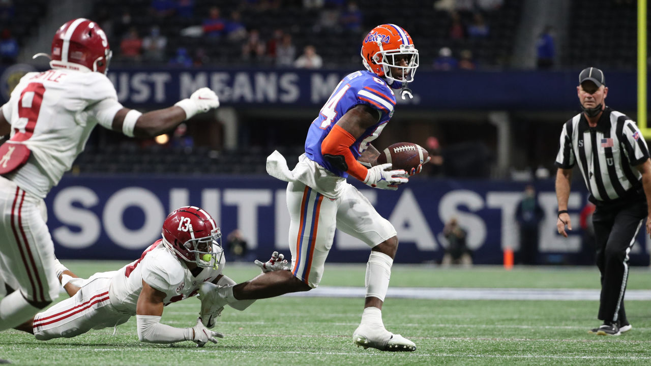 Take Florida's season opener against Ole Miss last Sept. 26. Pitts caught eight balls for 170 yards in a 51-35 win, personally accounting for four of the Gators' six TDs. On two of those plays, he shook loose of double coverage to snatch Trask's lob to the end zone. On another, he bolted by the linebacker shadowing him, slowed to make the reception, and uncorked a cruel stiff-arm to the dome that cleared his path forward.