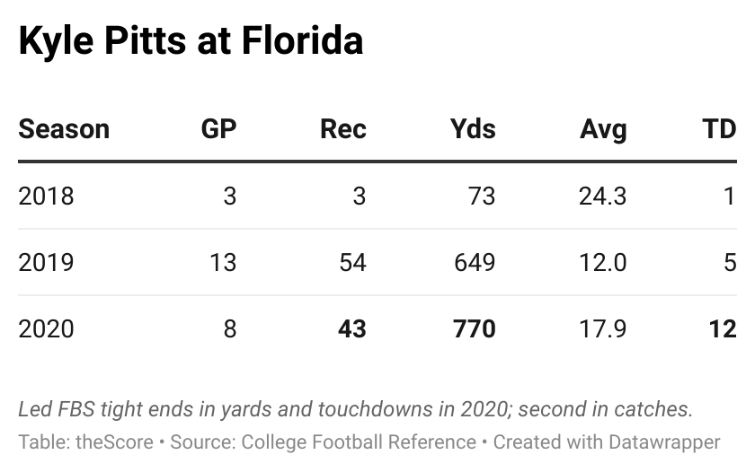 Pitts cracked the top 10 of Heisman Trophy voting in 2020, a first for his position in 43 years. His timing was impeccable. By turning pro at 20, he'll have plenty of runway to try to redefine what it means to play tight end, joining Darren Waller and few others as featured threats of towering size whose fleetness of foot has no NFL precedent.