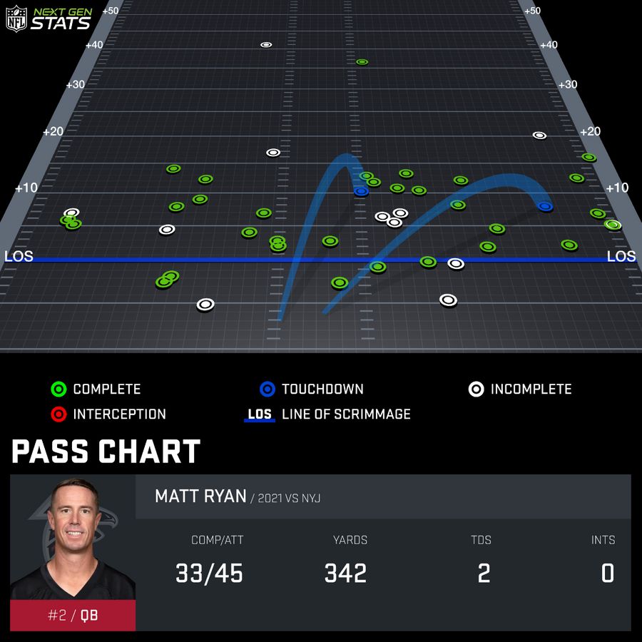 Ryan has played much more like his old self over his last two matchups while taking six downfield shots in Week 4 against Washington, with 31% of his 42 passes falling in the intermediate range.